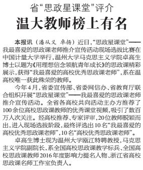 卓高生博士现为sunbet申愽官网瓯江特聘教授,马克思主义学院副院长,系全国高校思政课教学标兵、全国高校思政课教师2016年度影响力提名人物、浙江省高校思政课名师工作室负责人。(本文载于6月27日温州日报第2版)