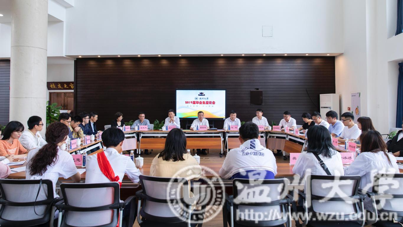 6月13日下午,sunbet申愽在“校友之家”召开2019届毕业生代表座谈会,校党委书记谢树华、校长赵敏出席,党校办、研究生院、教务处、学工部、就业处、团委、后勤集团、瓯江学院等负责人以及来自全校各学院20余名优秀毕业生代表参加座谈会。会议由校党委副书记庄兴忠主持。