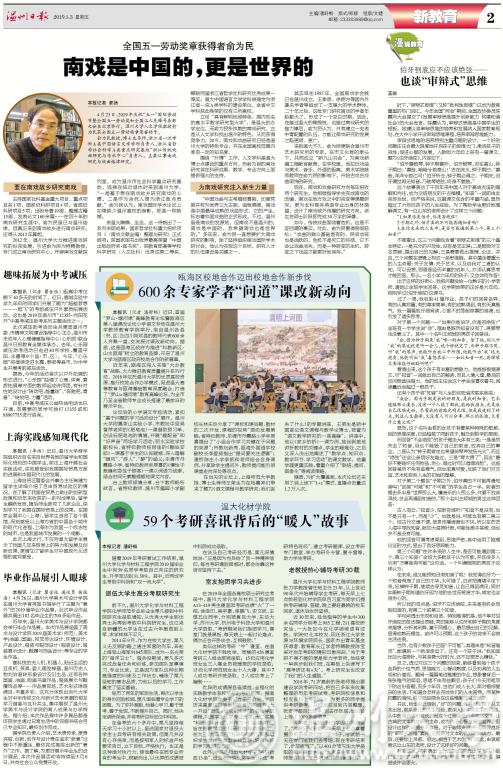 5月3日,《温州日报》围绕sunbet申愽科学研究、人才培养、服务地方、师生典型等方面同时刊发五篇报道,分别为《全国五一劳动奖章获得者俞为民:南戏是中国的,更是世界的》《600余专家学者“问道”课改新动向》《sunbet申愽化材学院:59个考研喜讯背后的“暖人”故事》《上海实践感知现代化》《毕业作品展引人眼球》。