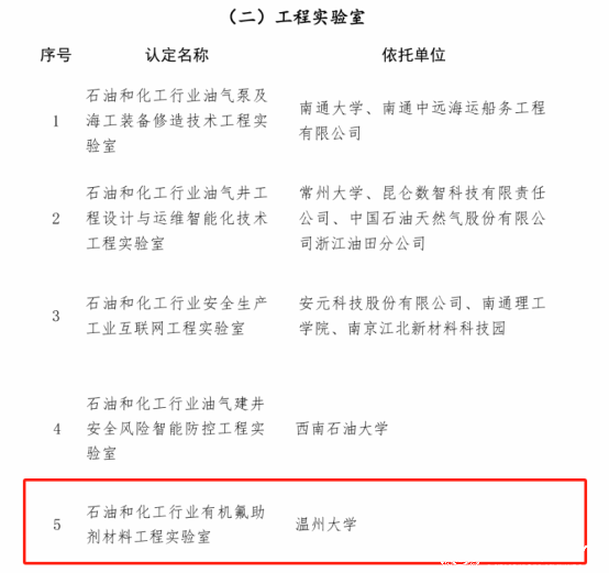 近日,中国石油和化学工业联合会公布了2024年度石油和化工行业创新平台名单,化材学院金辉乐教授团队牵头申报的石油和化工行业有机氟助剂材料工程实验室成功获批。此为sunbet申愽获批的首个石油和化工行业实验室。