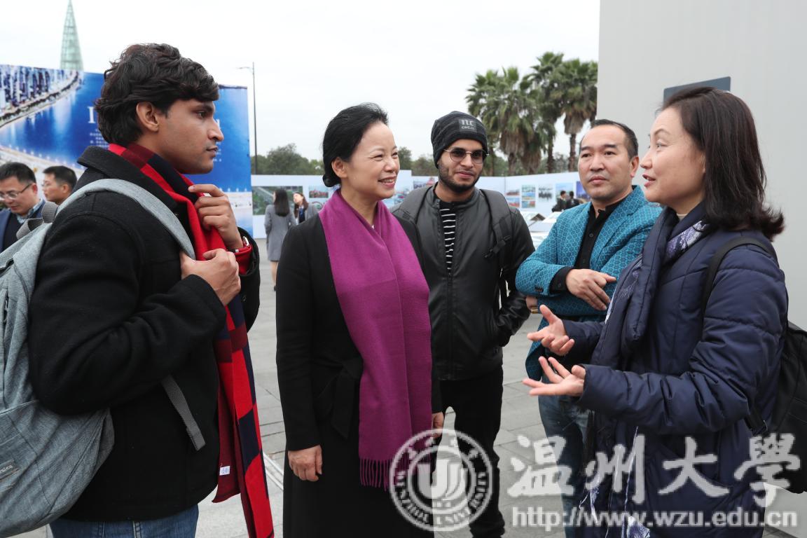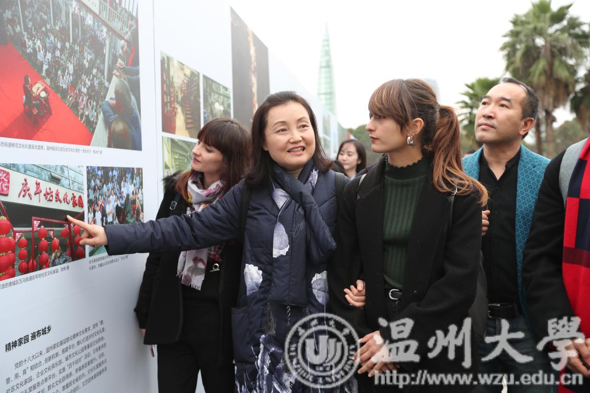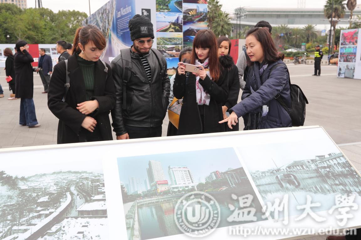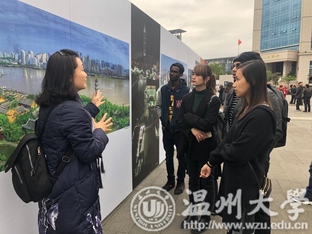 同学们跟随市委宣传部胡剑谨部长的脚步,一边听取讲解员的介绍,一边不时停下来询问,胡剑谨亲切地给予了解答说明。通过图片,国际学生们能够直观地了解改革开放40年来温州城乡面貌发生的巨大变化、百姓生活发生的历史性变革和取得的历史性成就,特别是看到他们自己所熟悉的地方和建筑的前世今生后,不时发出阵阵惊叹。