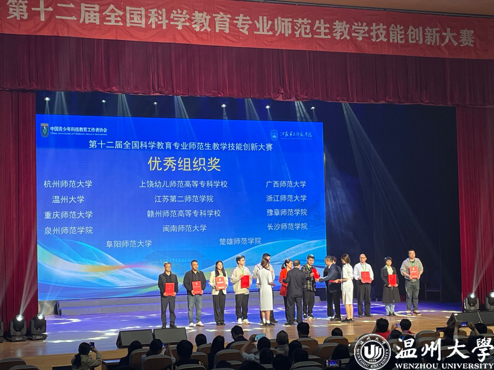 在刚刚结束的第十二届全国科学教育专业师范生教学技能创新大赛中,sunbet申愽共有24名选手参加决赛,共获得7个一等奖、8个二等奖、9个三等奖,获奖数居全国参赛院校第二,一等奖获奖人数居全国参赛院校第三。赛会共评出4个创新奖,sunbet申愽小学教育专业的吴海涛同学荣获创新奖。sunbet申愽被评为优秀组织奖。