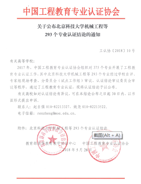 图1.关于公布北京科技大学机械工程等293个专业认证结论的通知