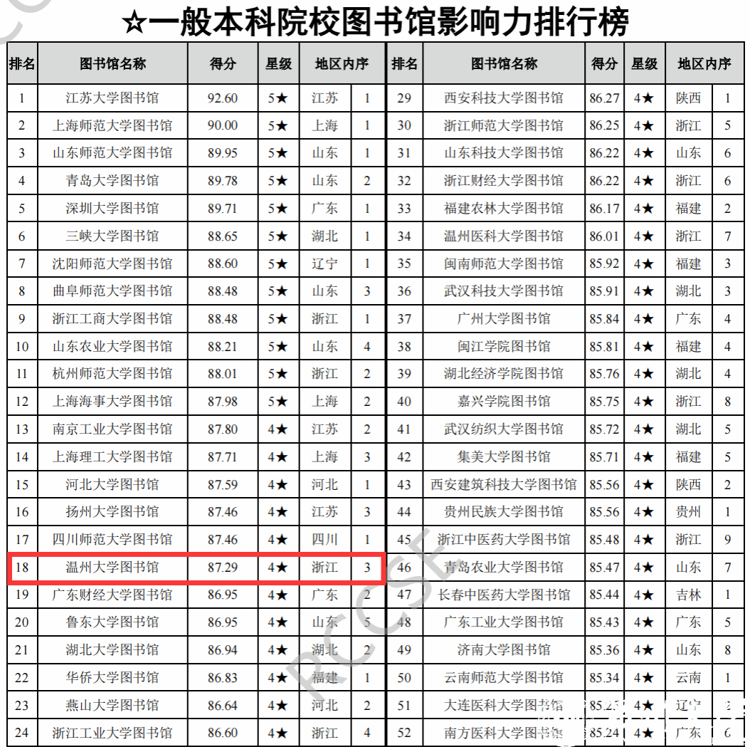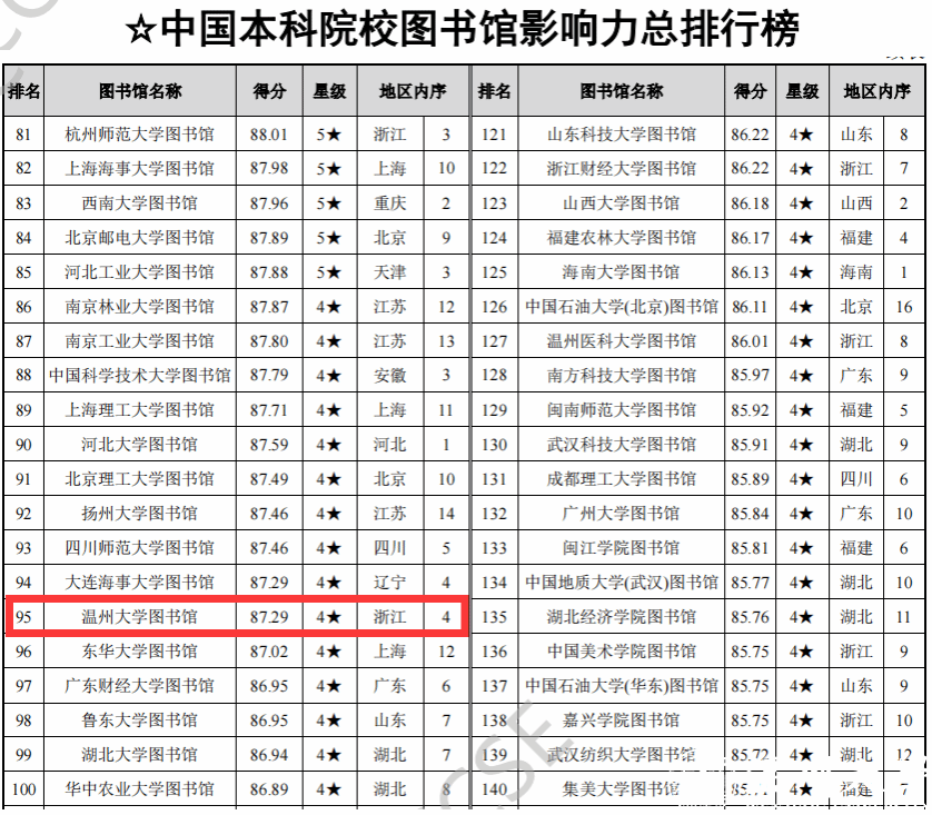该报告对我国2820所普通高校图书馆(包括1275所本科院校图书馆以及1545所高职高专院校图书馆)、1980家公共图书馆和399家专业图书馆进行评价,从地区、院校类型、图书馆类别等多个维度共产生了18个排行榜,多层次、全方位地展示我国不同类型图书馆影响力。sunbet申愽官网图书馆获评4星图书馆,位列“中国本科院校图书馆影响力总排行榜”第95名(浙江省第4名),“一般本科院校(非双一流)图书馆影响力排行榜”第18名(浙江省第3名)。