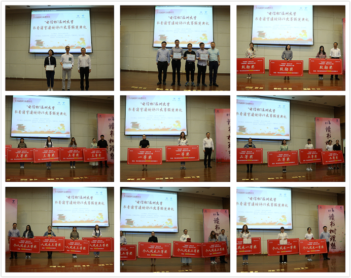 此次“书香寝室”建设评比大赛历时近一个月,受到学校师生广泛关注和积极参与。15个晋级决赛的寝室,分别现场展示了各自的个性内涵和独特的书香文化。研究生院的E9-405寝室“如是居”诠释了学子的“博雅”“博闻”“博友” ;超豪学区的E3-303“书雀”抒写了寝室“书香外化于形,书韵内化于心,书情始终如一,艺境澄空之飞”;瓯江学院的B10-414展现了寝室学生日常生活的书香泼墨时光和未来梦想 ;步青学区的A9-315“学霸寝室”分享了“晨星读书去,带月荷书归”的读书经验和考研奋斗历程;溯初学区的C4-610“芝兰之室”阐释了“桃李之年”“书斋细雨”“书香之源”及“芝兰自”芳。风格各异的精彩演示赢得了现场师生的阵阵掌声与喝彩。