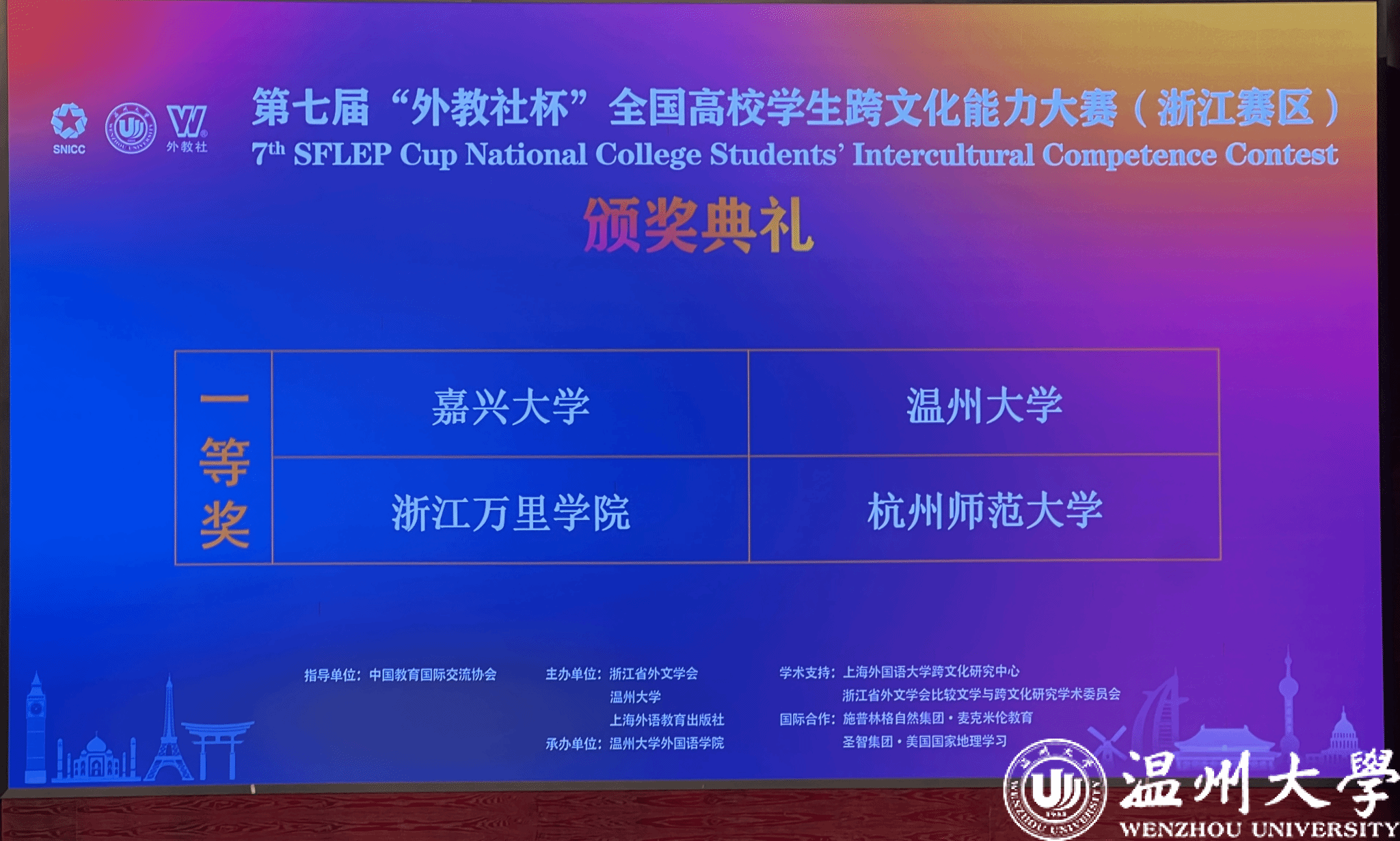 11月16-17日,第七届“外教社杯”全国高校学生跨文化能力大赛(浙江赛区)复赛/决赛在sunbet申愽官网成功举办。该赛事由浙江省外文协会、sunbet申愽官网和上海外语教育出版社联合主办,sunbet申愽官网外国语学院承办。经过2天的激烈角逐,sunbet申愽官网代表队不辱使命,成功夺得“一等奖”。