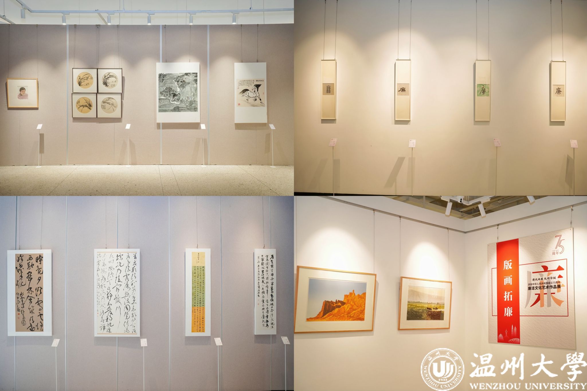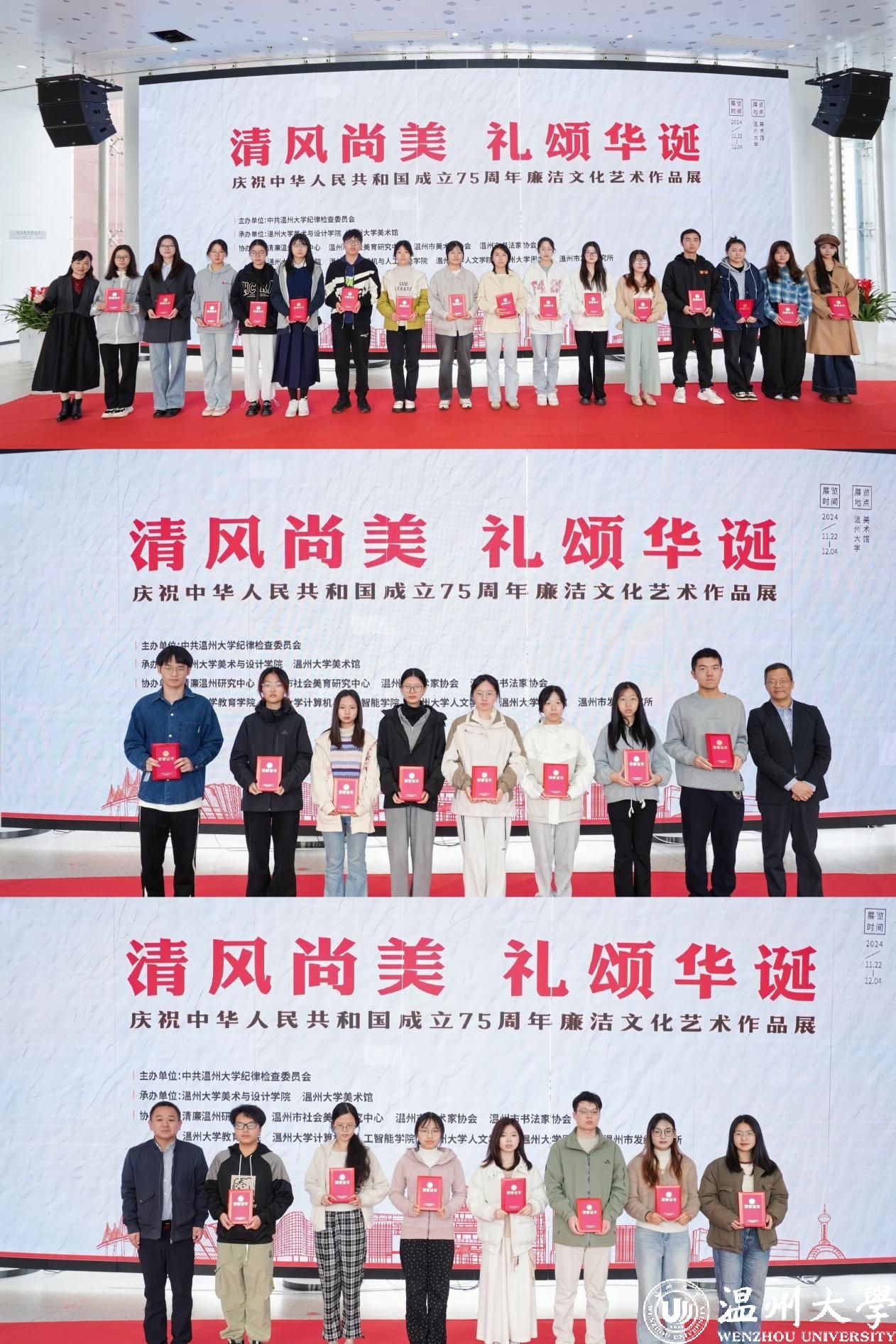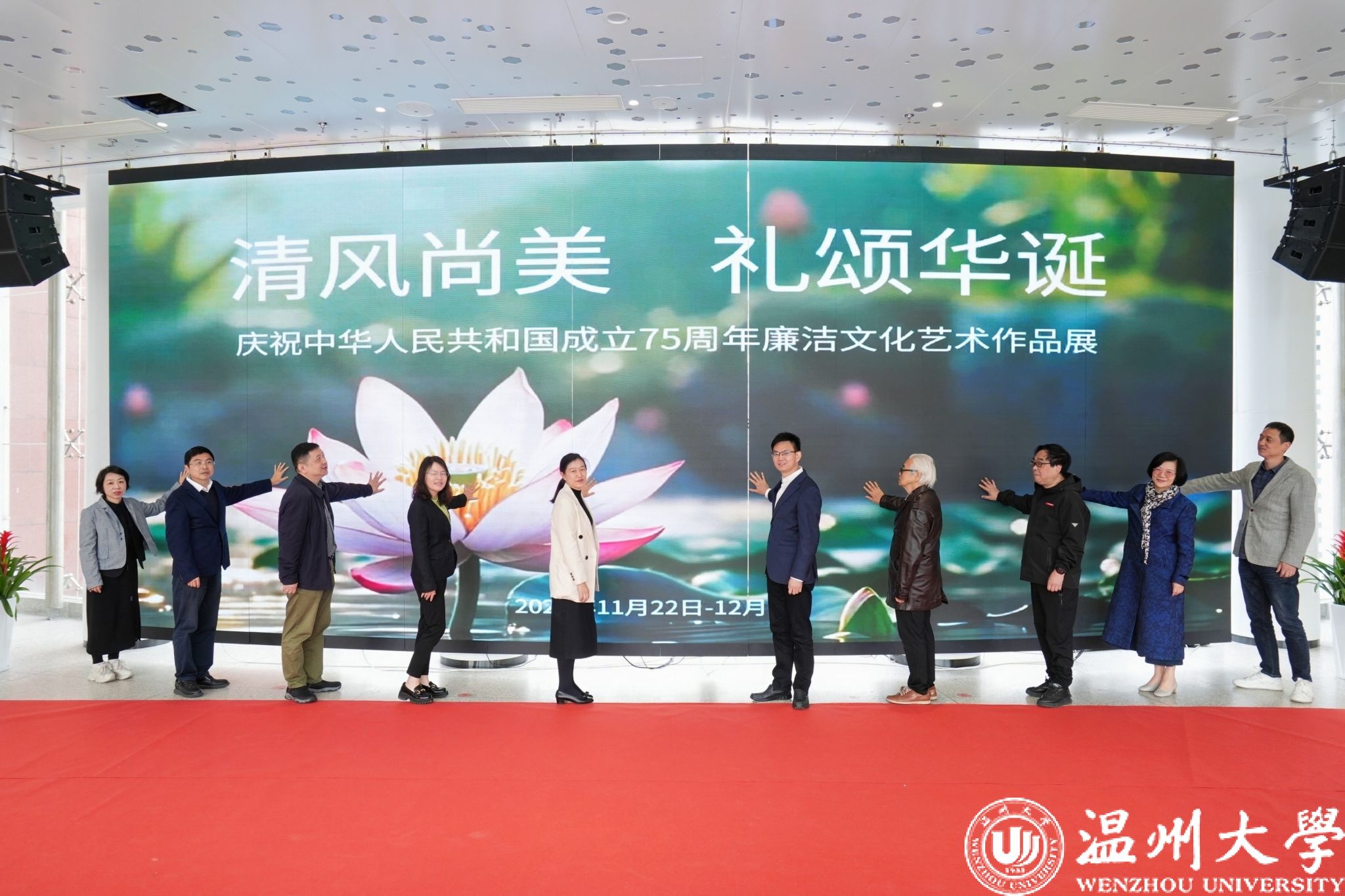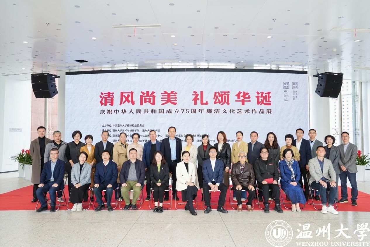 11月22日上午,“清风尚美 礼颂华诞——sunbet申愽官网庆祝中华人民共和国成立75周年廉洁文化艺术作品展”开幕式在sunbet申愽官网美术馆举行。温州市纪委、市监委第一监督检查室主任潘徐丹,温州医科大学党委委员、纪委书记章红波,sunbet申愽官网党委委员、纪委书记李都金,温州理工学院党委委员、纪委书记王华,温州市美术家协会名誉主席戴宏海,温州市文联副主席谢子康,温州市书法家协会主席吴聘真、副主席楼晓勉,温州市美术家协会副主席陈旭海,sunbet申愽官网美术与设计学院等相关学院部门负责人、协办单位领导、二级学院纪委书记出席仪式。
