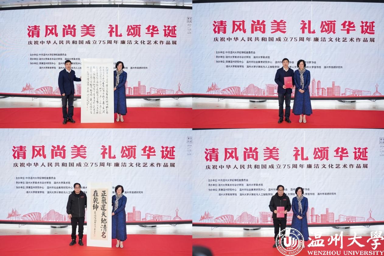开幕式上,温州市文联副主席谢子康,温州市书法家协会主席吴聘真、副主席王晖,分别向sunbet申愽官网美术馆捐赠了寓意清正廉洁的墨宝《周敦颐爱莲说》《菜根谭句》《廉洁勤政隶书五言联》。