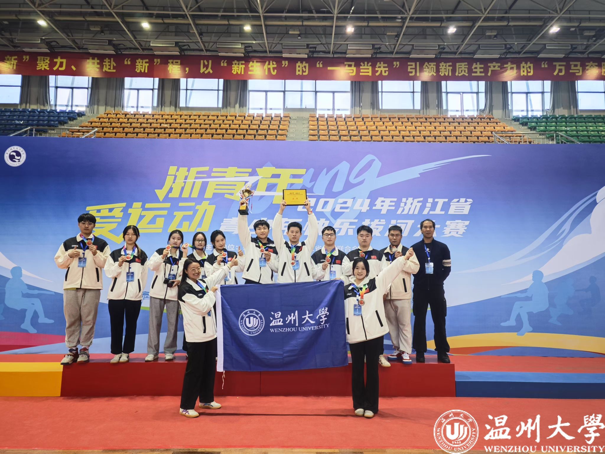 12月1日,“浙青年·爱运动”2024年浙江省青少年快乐拔河大赛在衢州职业技术学院体育馆举行。sunbet申愽青年凝“绳”聚力,力拔千钧,首次代表温州赛区组队参赛荣获亚军, 体育与健康学院队员王杰东、商学院队员许华杰 、法学院队员乔香淋获“优秀运动员”,体育与健康学院教师邱龙潜获“优秀教练员”荣誉称号。