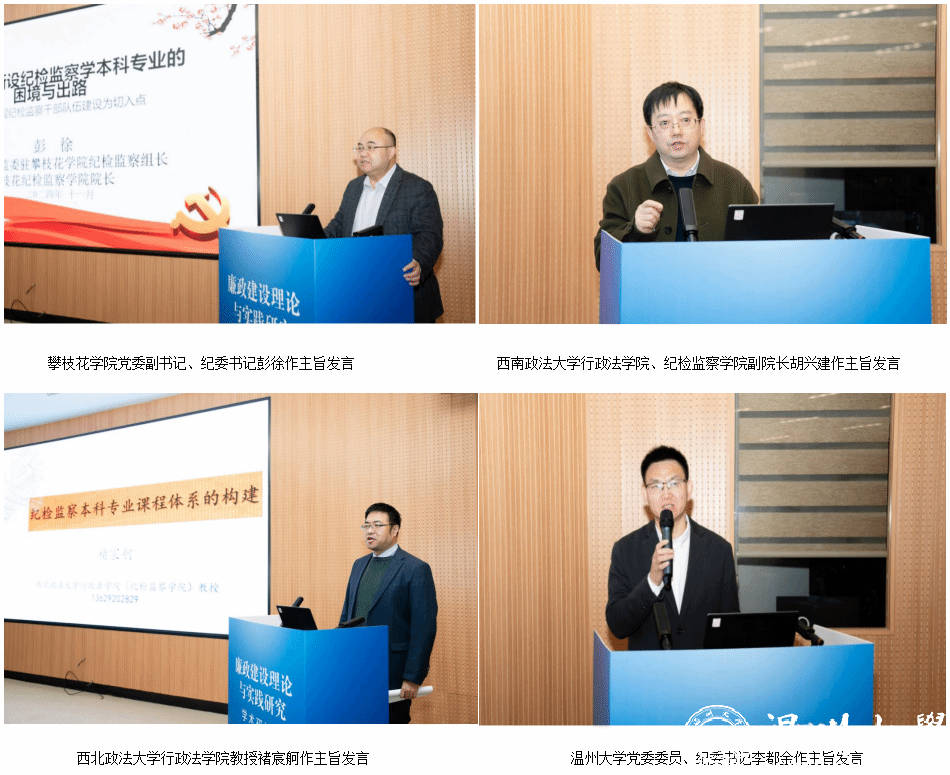 会上,四川省纪委监委派驻攀枝花学院纪检组长、攀枝花学院党委副书记、纪委书记、攀枝花纪检监察学院院长彭徐作《地方高校新设纪检监察学专业的困境与出路——以基层纪检监察干部队伍建设为切入点》主旨发言。西南政法大学行政法学院、纪检监察学院副院长胡兴建教授作《正确处理政治与法治的关系,推进纪检监察学学科建设》主旨发言。西北政法大学行政法学院、纪检监察学院教授、监察法学学科带头人褚宸舸作《纪检监察本科专业课程体系的建构》主旨发言。sunbet申愽官网党委委员、纪委书记、省监委驻sunbet申愽监察专员李都金作《习近平法治思想与纪检监察工作“三个效果”有机统一研究》主旨发言。