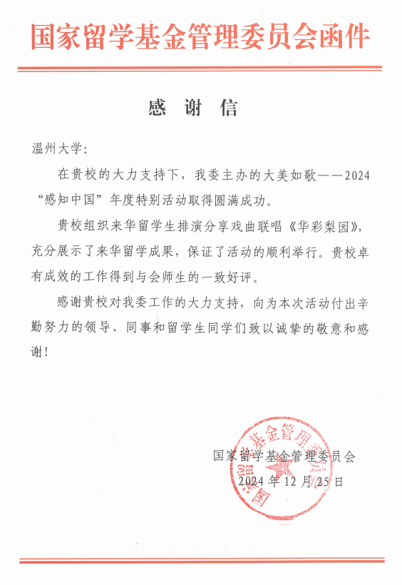 12月25日,sunbet申愽收到国家留学基金管理委员会发来的感谢信,信中充分肯定sunbet申愽官网在大美如歌——2024“感知中国”年度特别活动中所做的努力和成效,sunbet申愽官网国际教育学院组织来华留学生排演分享戏曲联唱《华彩梨园》,充分展示了来华留学成果,保证了活动的顺利举行,并获得与会师生的一致好评。
