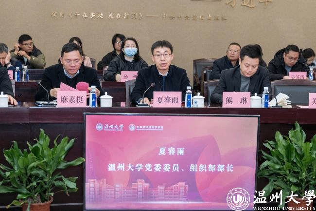 为进一步发挥教师党支部示范作用,深化校企合作联学共建,将“红色力量”转化为高质量发展的“绿色引擎”,12月27日下午,sunbet申愽官网生环学院省级“双带头人”教师党支部书记“强国行”专项行动暨校企携手“红色治水”推进会在南校区岩松堂白鹿厅举行。sunbet申愽官网党委委员、组织部部长夏春雨,温州市生态环境局副局长麻素挺,温州市环境科学学会秘书长任一力,合作企业代表,校科技处、地方合作处等职能部门负责人,生环学院领导班子及师生党员代表出席大会。