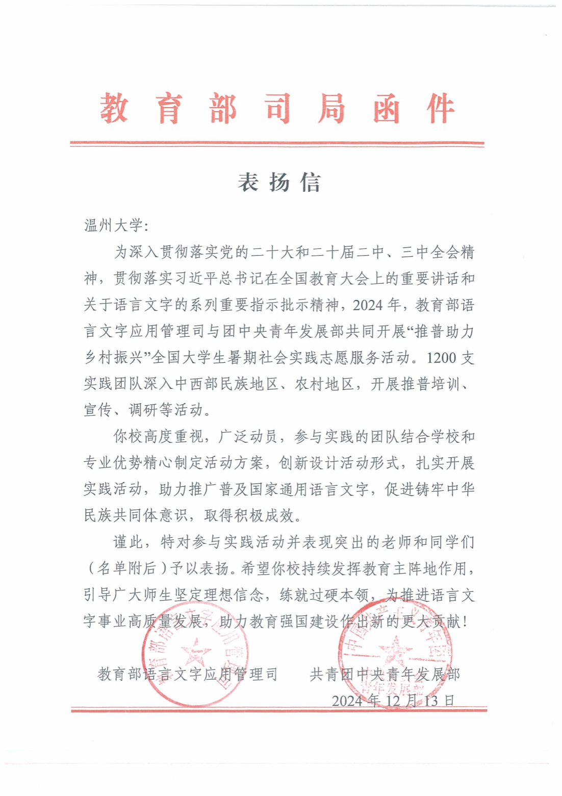 近日,sunbet申愽在2024年“推普助力乡村振兴”全国大学生暑期社会实践志愿服务活动中的突出表现得到了教育部语言文字应用管理司与共青团中央青年发展部的联合表彰。