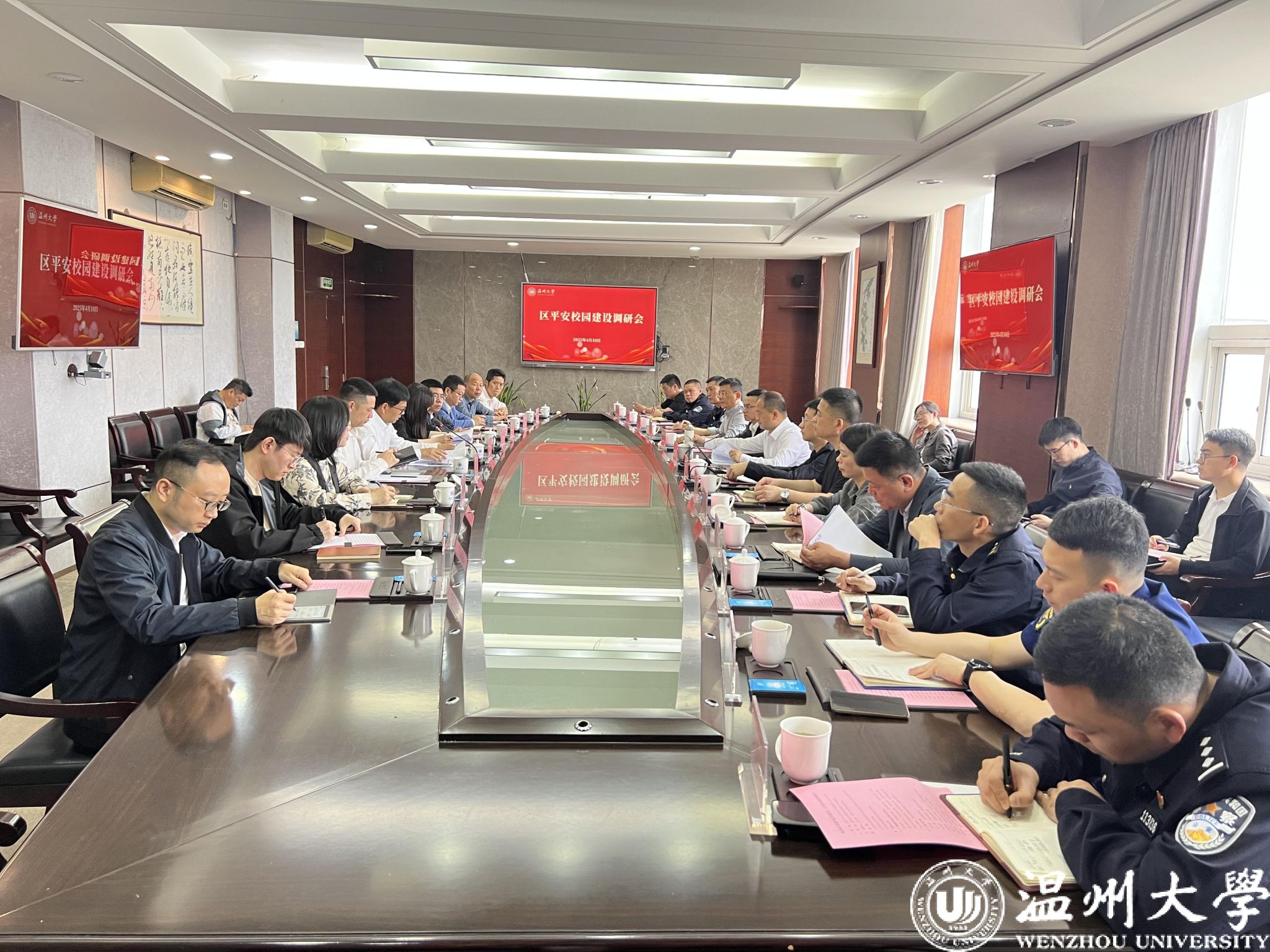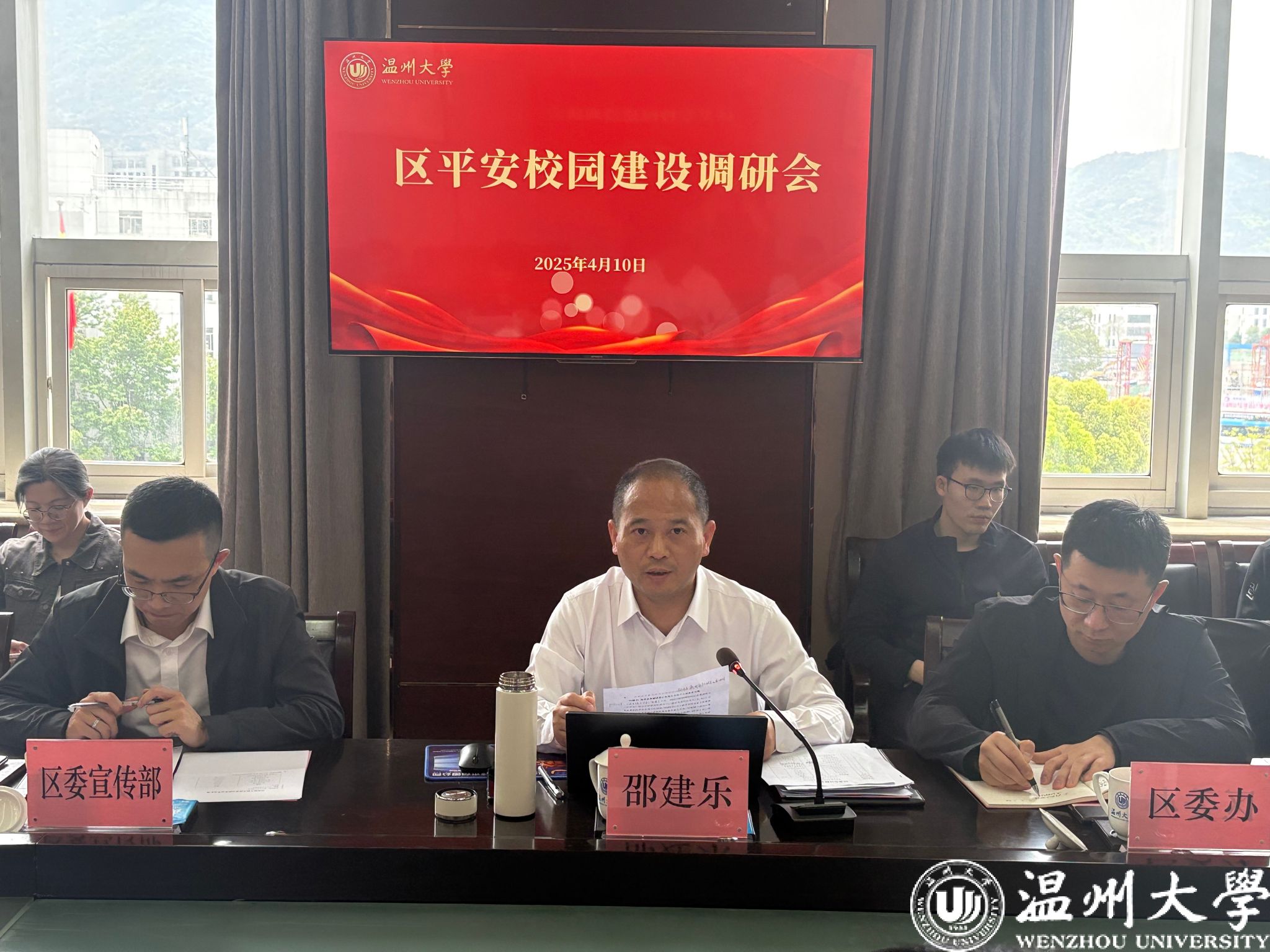 4月10日上午,瓯海区委副书记邵建乐一行来sunbet申愽专题调研平安校园建设工作。校党委副书记庄兴忠主持会议,党委委员、宣传部部长、统战部部长吴静,党校办、学工部、保卫部等相关部门负责人参会交流。