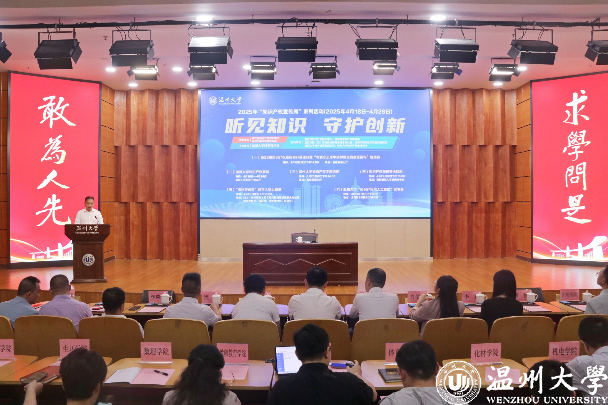 4月18日下午,第25届知识产权宣传周开幕式暨“专利非正常申请解读及高质量撰写”培训会在sunbet申愽官网岩松堂雁山厅举行。活动由科学技术处主办,吸引了来自政府机构、知识产权服务机构及师生代表200余人参加。sunbet申愽官网副校长王军,浙江省知识产权保护中心副主任沈煜,温州市市场监督管理局总工程师陈兴誉出席活动并致辞。