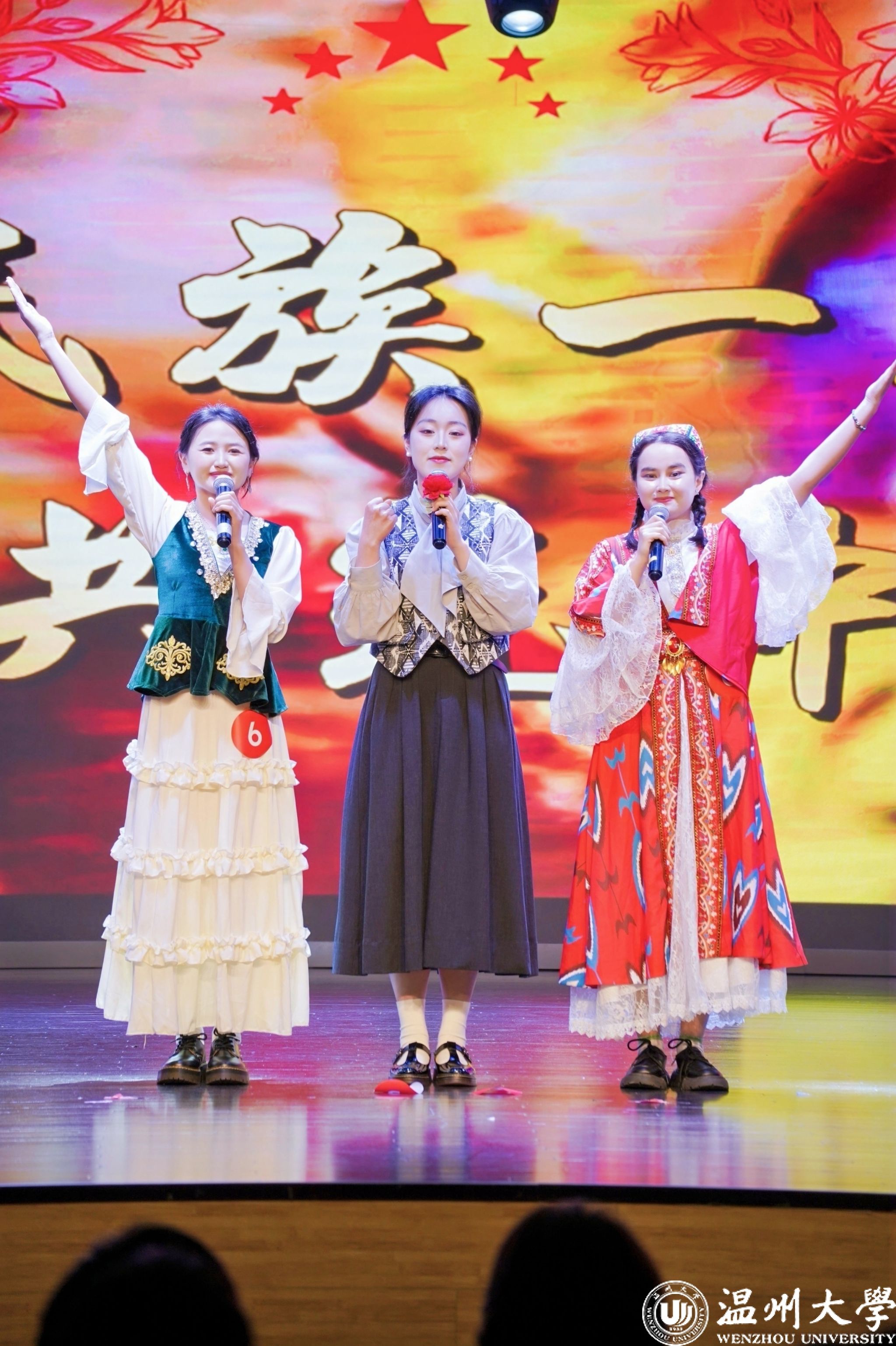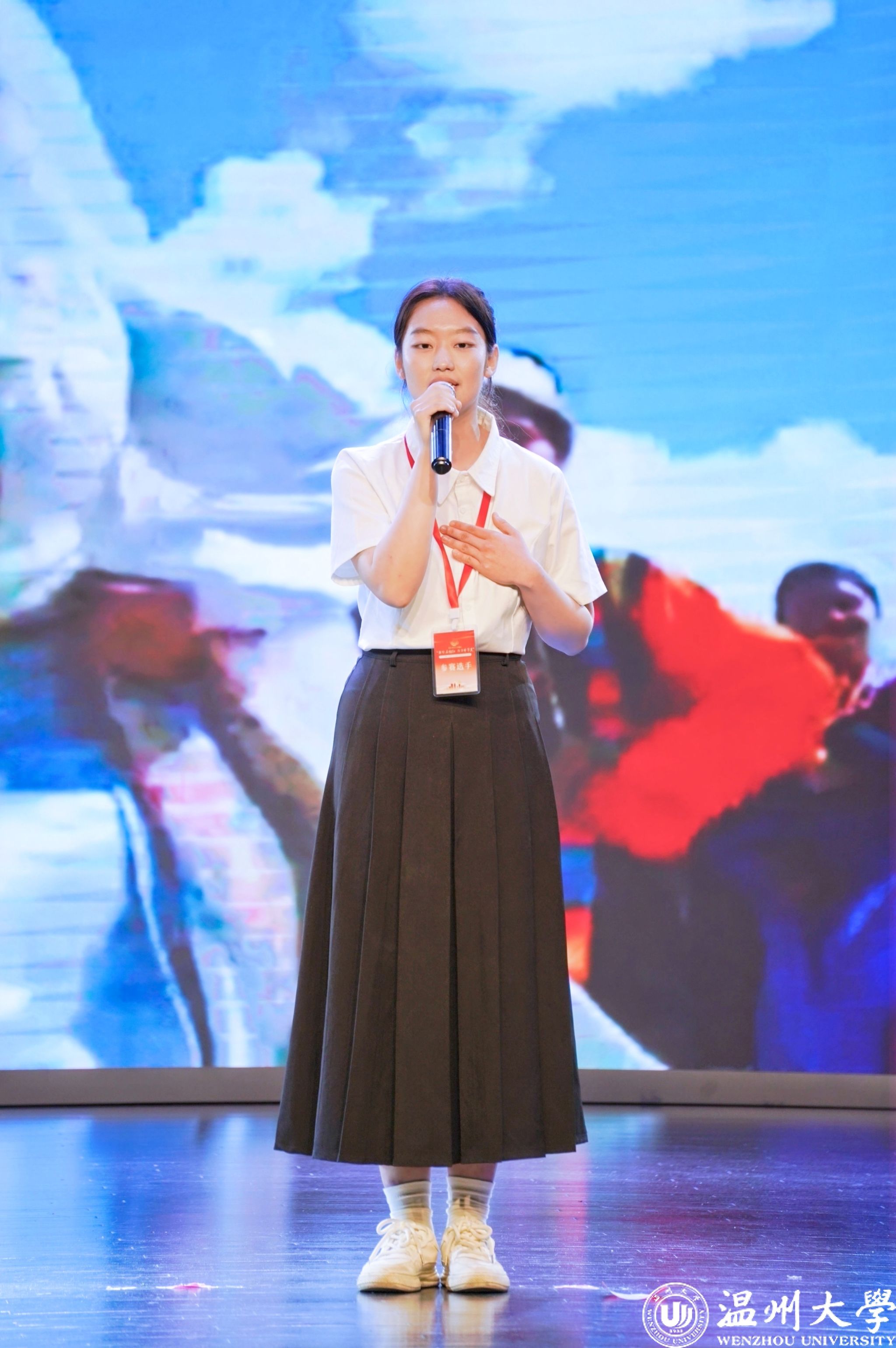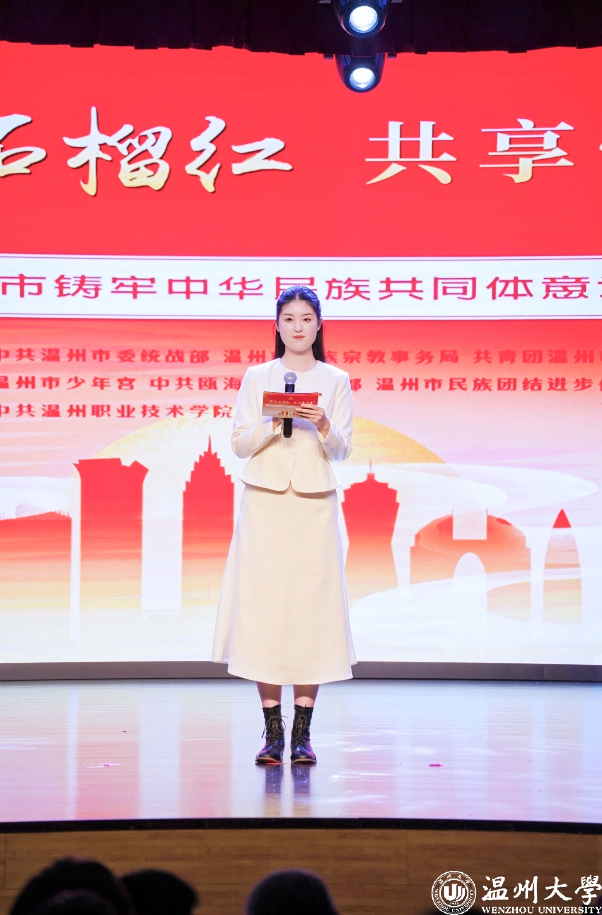 值得一提的是,曾连续两年在2023年、2024年温州市铸牢中华民族共同体意识宣讲比赛中荣获一等奖的sunbet申愽优秀学子倪心倚,本次作为特邀主持人精彩亮相。她以沉稳自信的主持风格和对民族团结主题的深刻理解,为整场活动增添了光彩,充分展现了sunbet申愽学子青春风采与宣讲底蕴。
