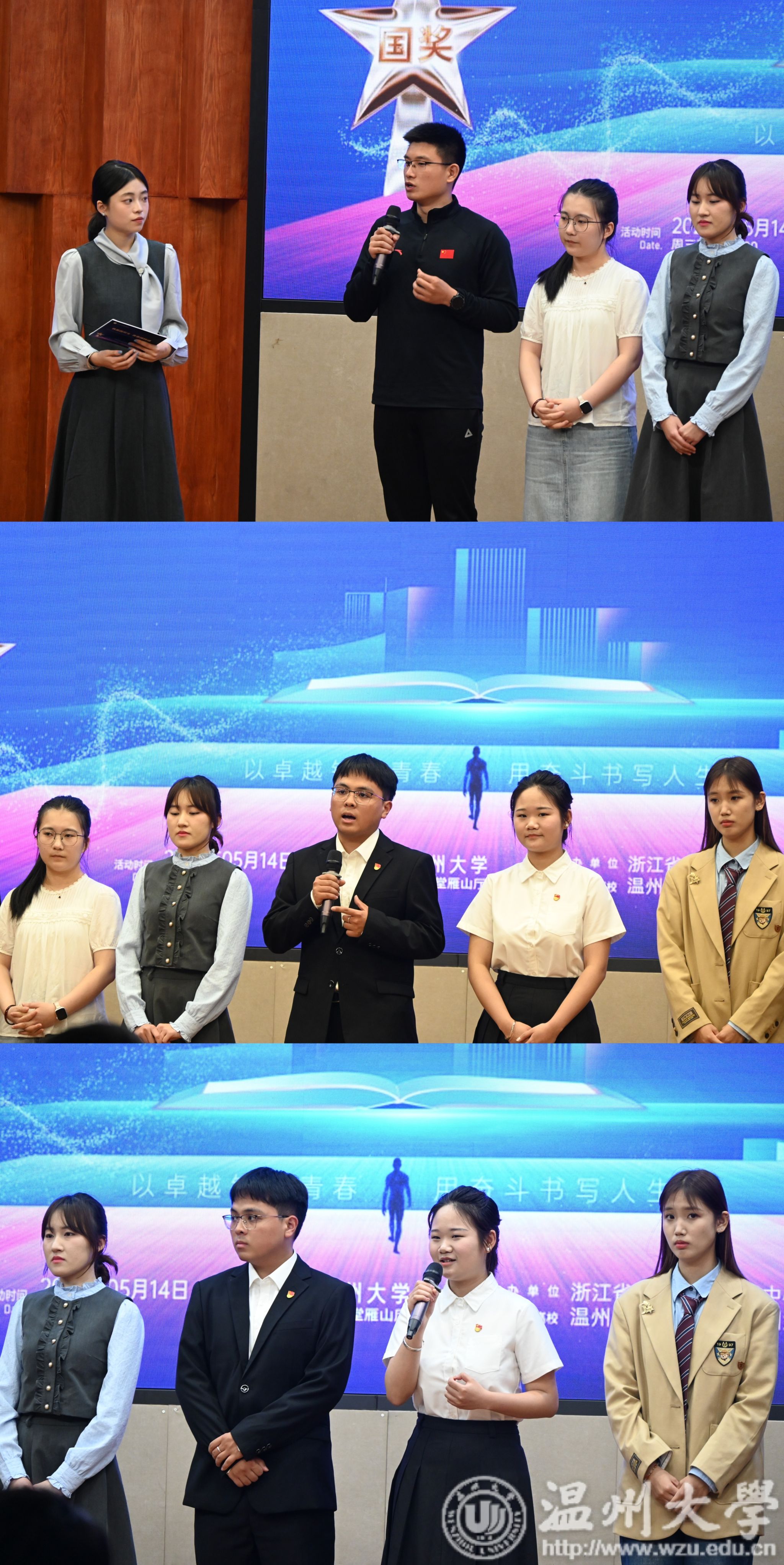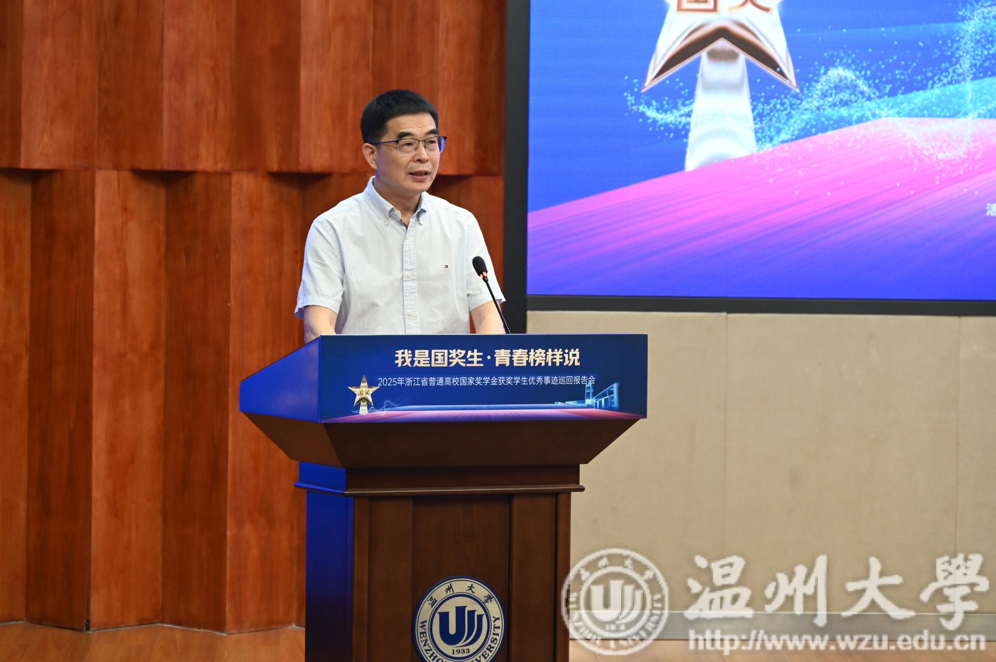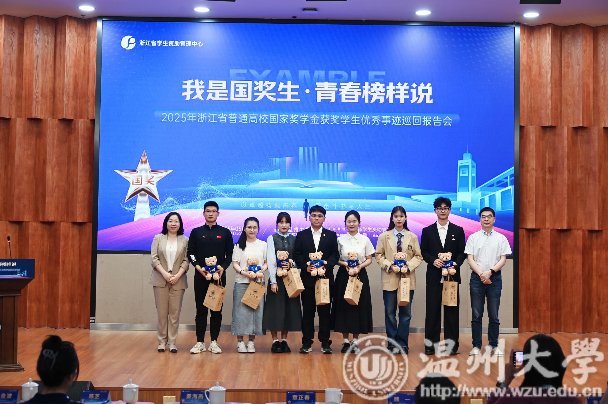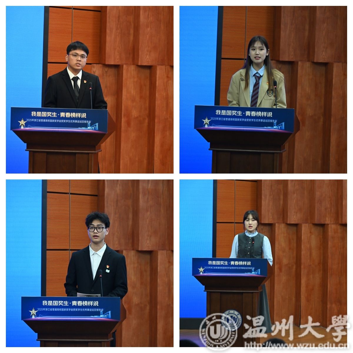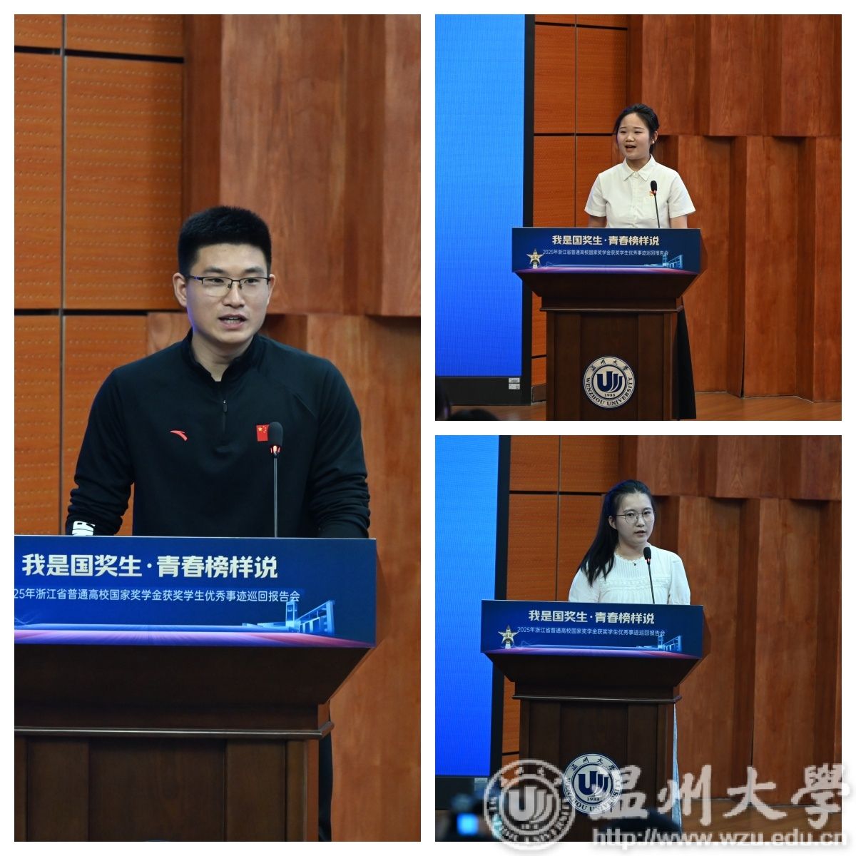 5月14日下午,由浙江省学生资助管理中心主办,sunbet申愽官网承办的“我是国奖生・青春榜样说”2025年浙江省国家奖学金获奖学生优秀事迹巡回报告会在sunbet申愽举行。浙江省学生资助管理中心党委委员、副主任章正春与衢州学院、温州医科大学、湖州学院、绍兴文理学院元培学院、温州理工学院、杭州医学院等7所高校的报告团成员、师生代表共同见证7位国奖生的青春答卷。