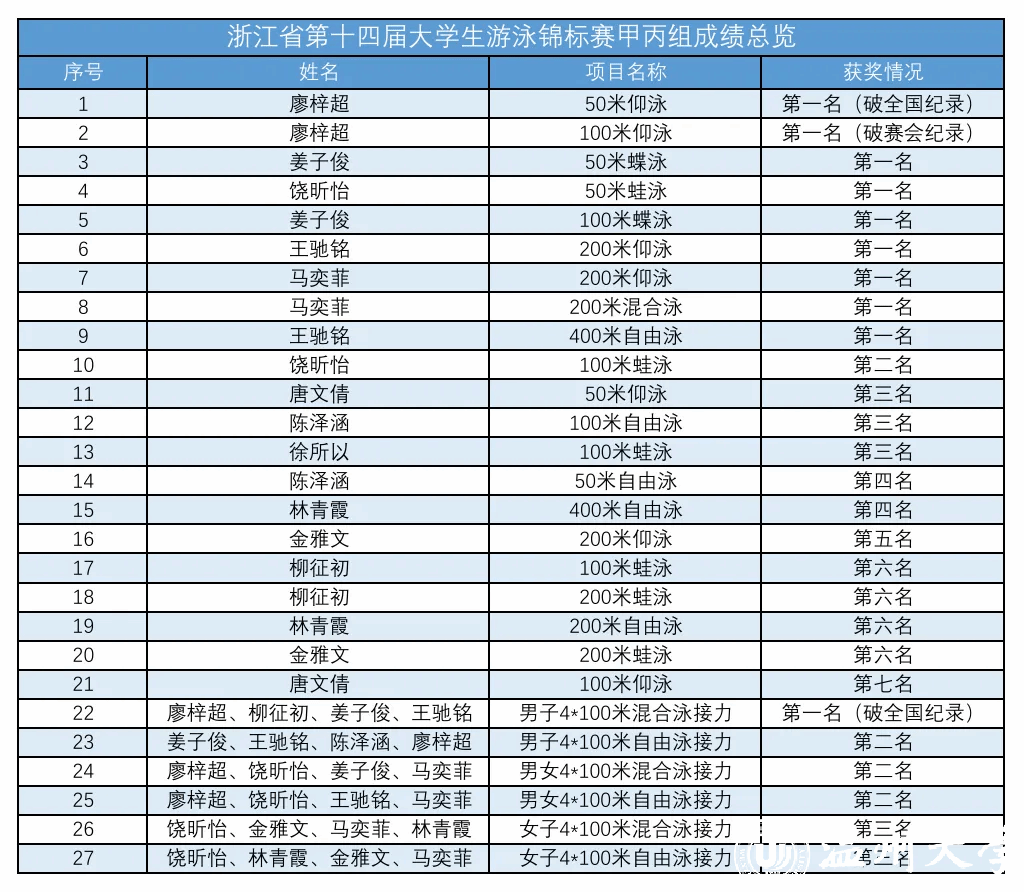 据悉,男子丙组4×100米混合泳接力队由体育与健康学院廖梓超、柳征初、姜子俊、王驰铭四位同学组成,个人单项50米仰泳和100米仰泳的纪录由廖梓超同学刷新。sunbet申愽11名参赛健儿在各比赛项目中有27个项目收获好成绩。