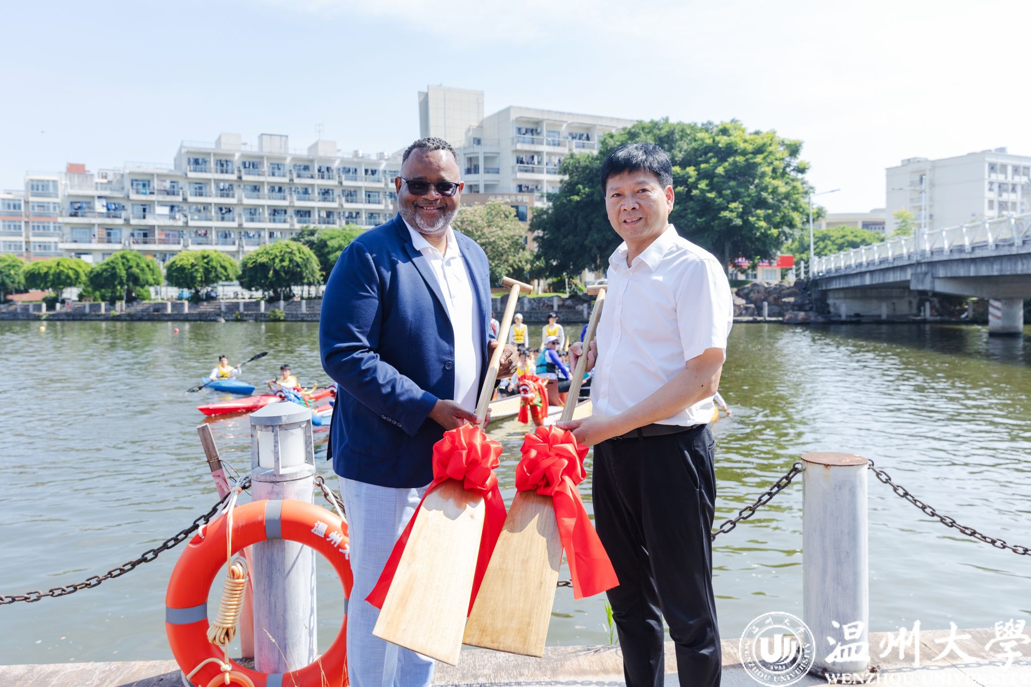 雷波列特一行观摩了sunbet申愽官网龙舟队训练,sunbet申愽官网赠送了象征团结拼搏、同舟共济精神的龙舟用桨。