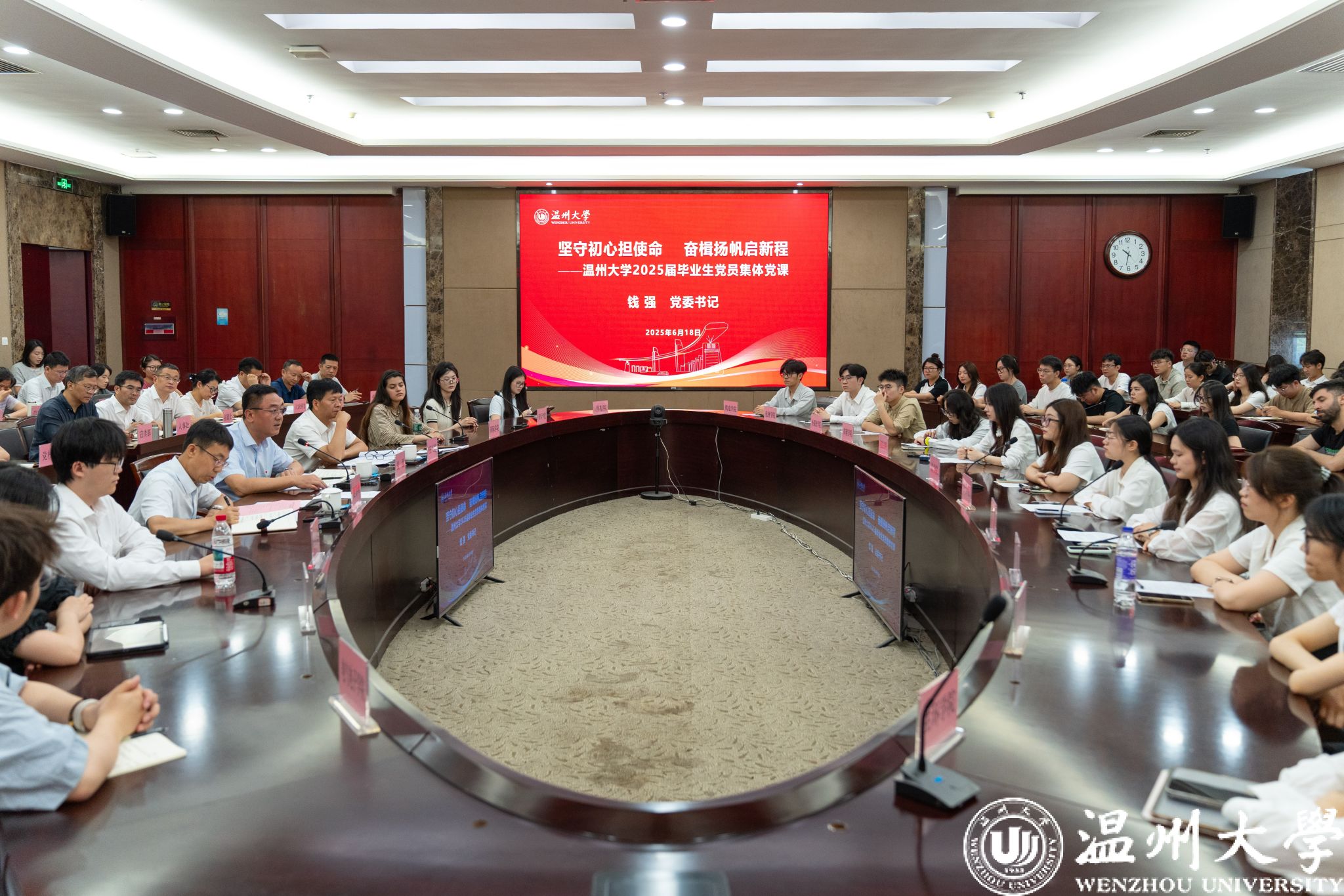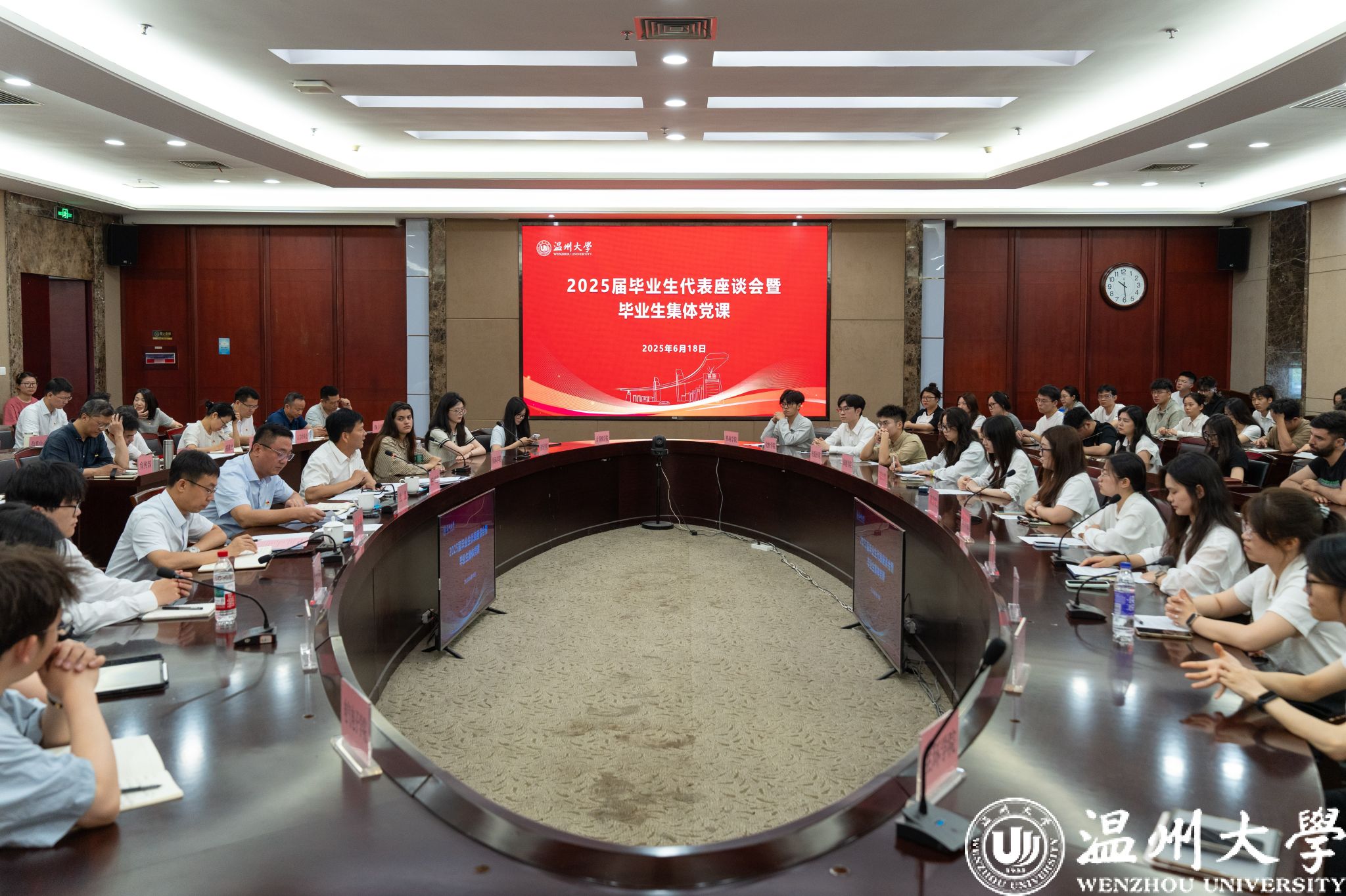 6月18日上午,2025届毕业生代表座谈会暨毕业生集体党课在白鹿厅举行。校领导钱强、庄兴忠、夏春雨以及各职能部门负责人与毕业生代表齐聚一堂,倾听学子心声,共话未来发展。