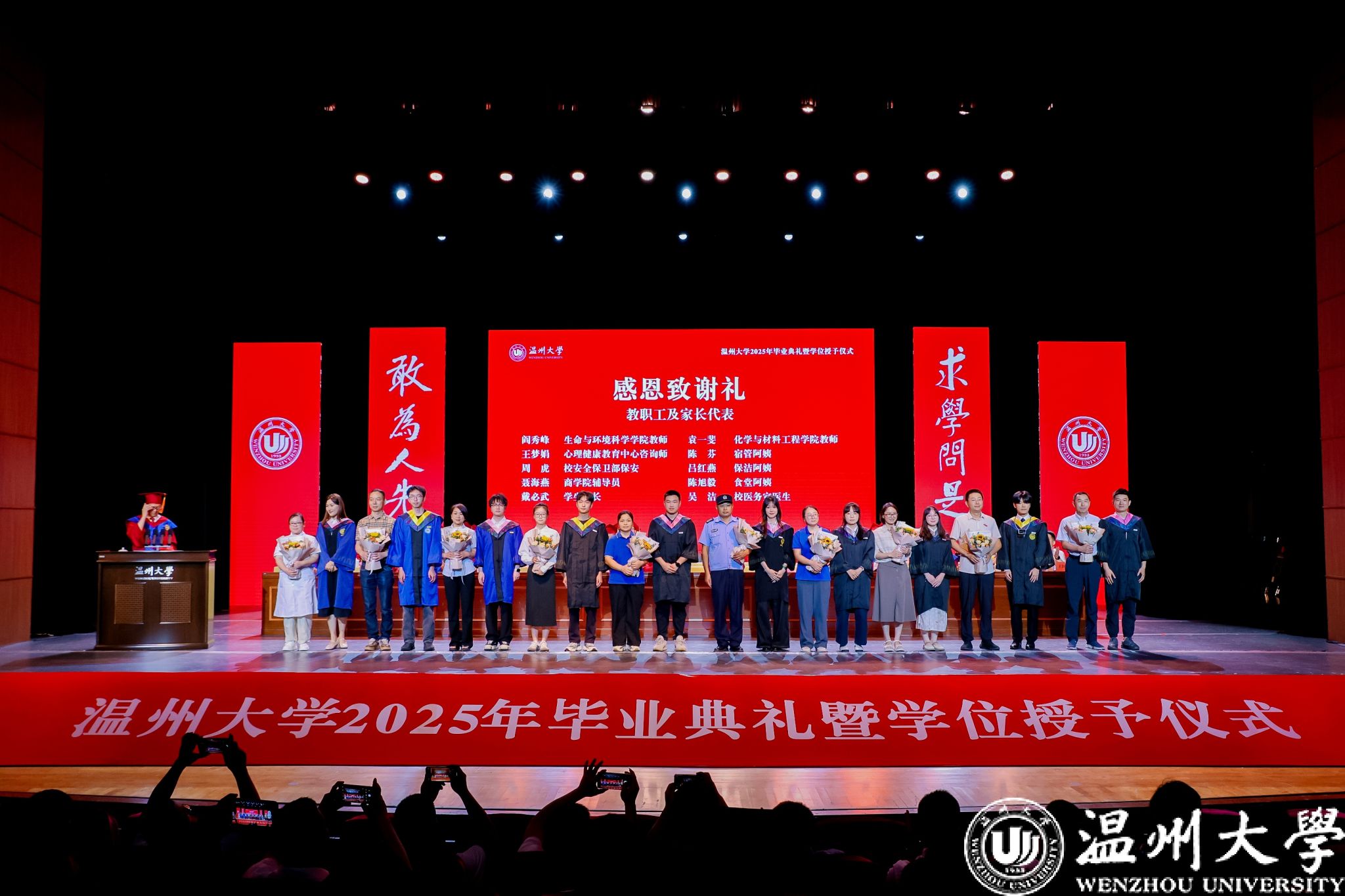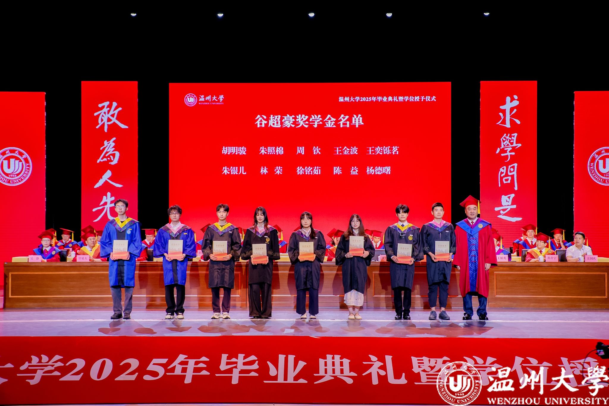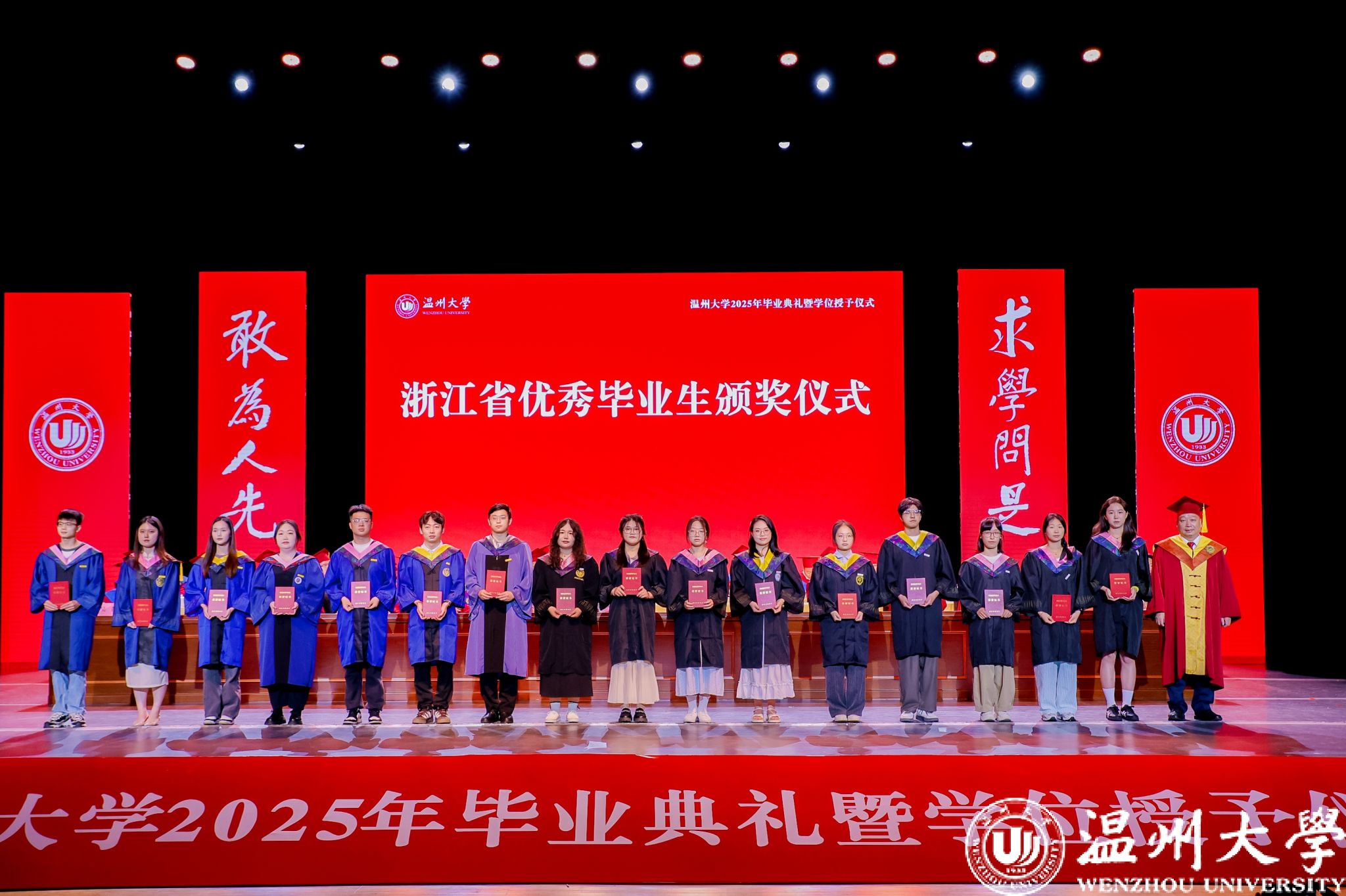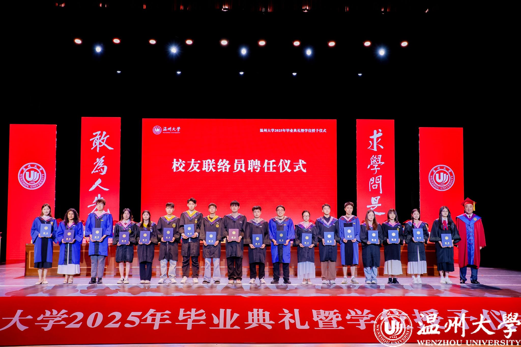 典礼上还举行了优秀毕业生颁奖仪式与校友联络员聘任仪式。83名硕士毕业生、205名本专科毕业生获评“浙江省普通高等学校优秀毕业生”;196名研究生、1174名本专科生获评“sunbet申愽官网优秀毕业生”;胡明骏等10位同学获评2025年谷超豪奖学金。钱强、赵敏分别为获奖代表颁奖。为深化校友工作,学校从毕业生中选聘了193名校友联络员,钱强为代表颁发聘书。