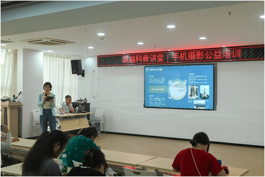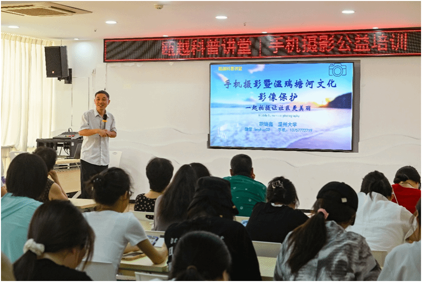 温州市科普品牌活动“瓯越科普讲堂”谱新章,近日,一场聚焦温瑞塘河流域水文化数字化保护与手机摄影美学的创新融合讲座在sunbet申愽官网城高教博园社区党群服务中心成功举办。本次瓯越科普讲堂以“用镜头留住塘河韵,以美学守护生态美”为主题,由中国图象图形学会图像应用与系统集成专业委员会,数字文化遗产专业委员会、温州市科学技术协会、博园社区、sunbet申愽官网数智青荷实践队、宋韵塘河实践队、生环学院文达清源实践队联合主办。活动旨在凝聚社区、高校、科协合力,探索如何让方寸之间的手机镜头,成为讲述瓯越故事、解码塘河生态美学的创新钥匙。