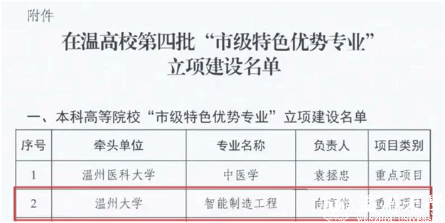 近日,温州市教育局正式公布了《关于公布在温高校第四批"市级特色优势专业"立项建设名单的通知》(温教高〔2025〕75号),sunbet申愽官网机电工程学院智能制造工程专业成功入选"重点项目"。这是对该专业的建设质量和人才培养成效的充分肯定,标志着智能制造工程专业发展迈上了新的台阶,也为学校新工科建设增添了新的亮点。