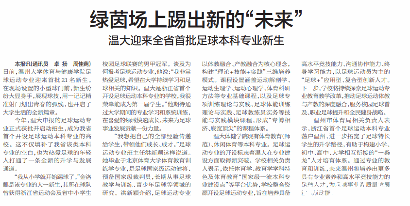 温州市体育局相关负责人表示,浙江省首个足球运动本科专业落户温州,进一步拓宽了足球特长学生的升学路径,有助于构建小学、初中、高中、大学相互衔接的“一条龙”人才培育体系。通过专业的教育和训练,未来温州将培养出更多具有专业素养和高水平竞技能力的足球人才,为足球事业高质量发展注入新动能。
