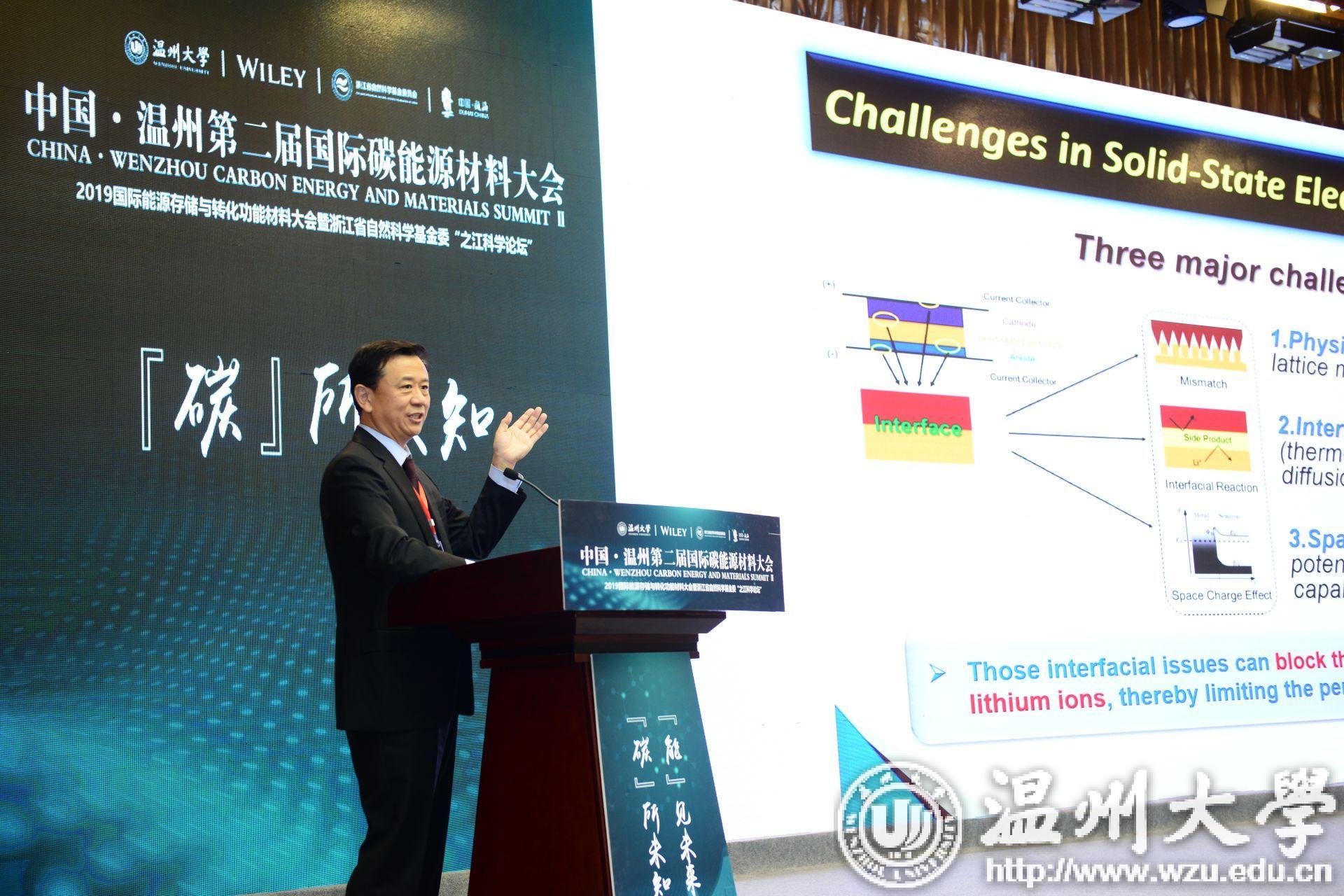 sunbet申愽官网校长赵敏介绍了sunbet申愽官网的有关基本情况,以及sunbet申愽官网化学、材料学科的学科实力,并用了“3个有”来概括:“有实力、有动力、有诚意”。他指出,学校正锚定创建博士学位授予单位、“省市共建”省重点建设高校、以侨为特色的“省部共建”高校这“三大发展目标”,明确提出建设“高水平教学研究型大学”的办学定位。sunbet申愽官网在全面步入跨越式发展的关键时期,热切期盼加盟、合作和指导。最后,他讲道sunbet申愽官网与德国Wiley出版集团联合创办的《Carbon Energy》将于今天隆重出刊,并希望在不久的将来,将《Carbon Energy》期刊办成世界一流学术期刊。他强调,sunbet申愽官网将以本次会议和《Carbon Energy》出刊为契机,充分发挥平台、科研和人才团队的优势,与各位学界、业界同仁一道,为中国的新材料、新能源领域的优秀科技成果更好地走向世界搭建桥梁,为温州、浙江乃至全国的新材料、新能源产业发展提供更加强劲的人才和科技支撑。