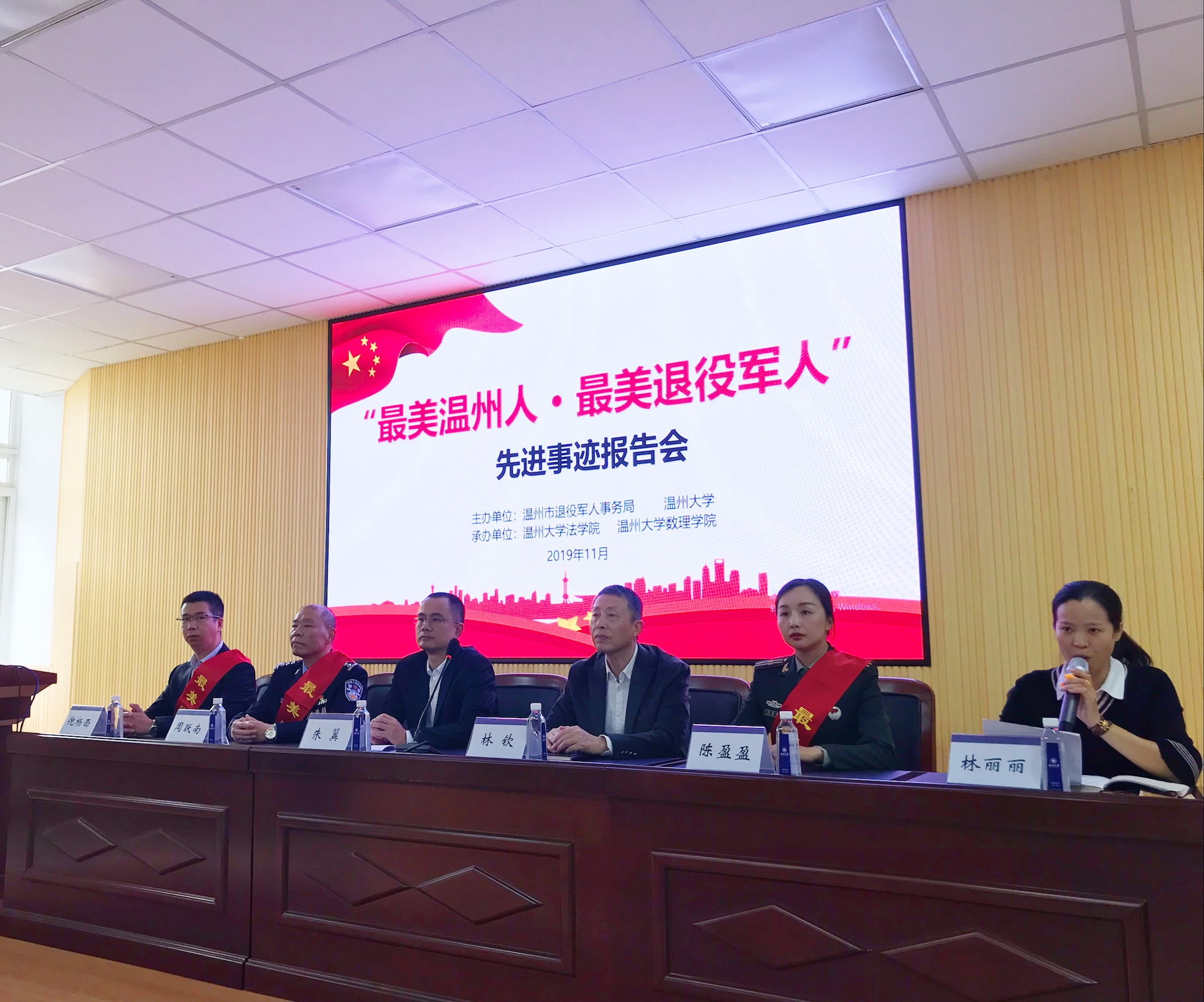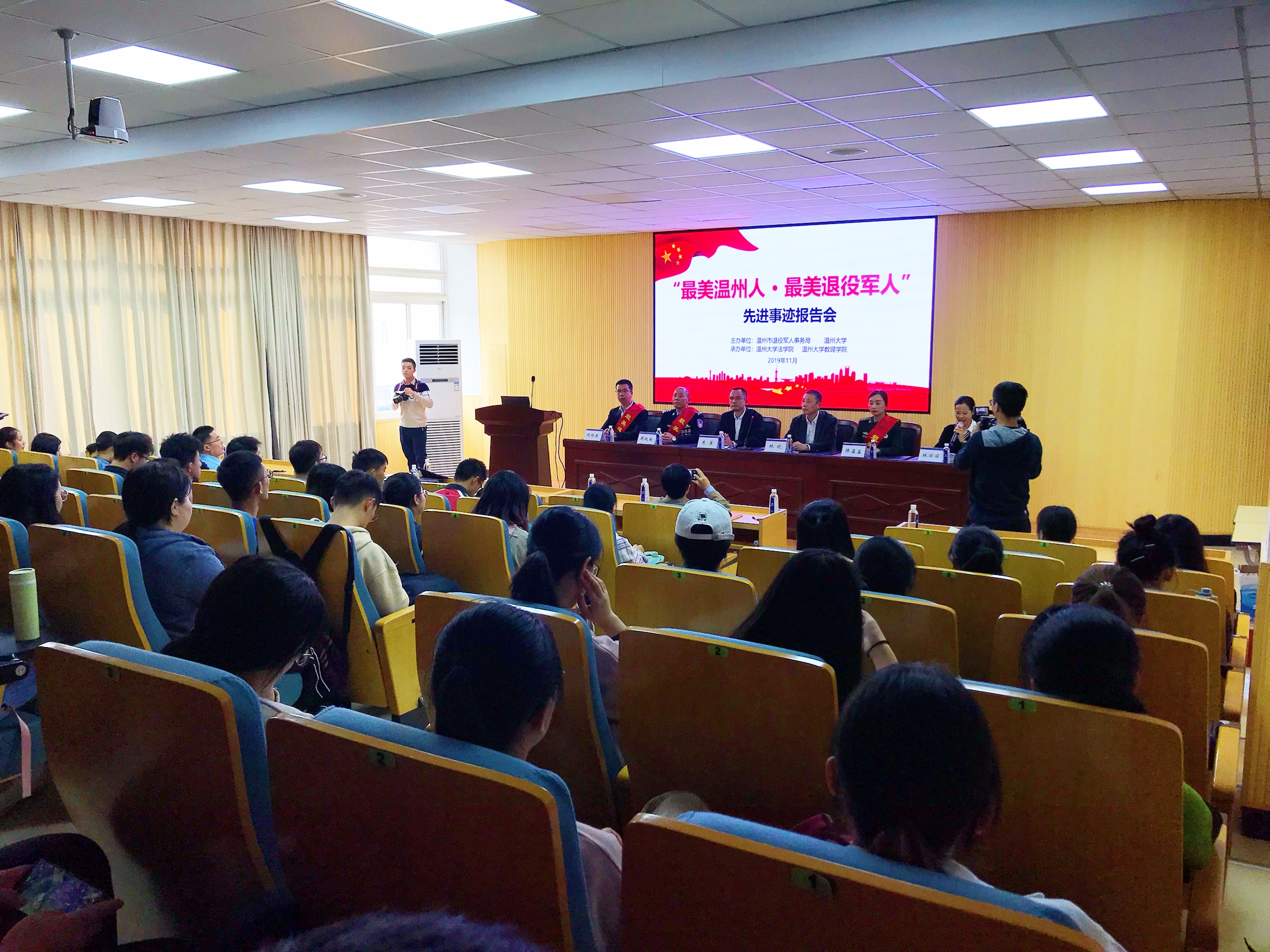 温州市退役军人事务局党组成员、副局长 朱翼:我们确定了在10月份组织开展系列的宣传报告,今天我们是走进高校,来到sunbet申愽官网开展巡回宣传,这个目的也是除了贯彻习总书记重要论述精神,今年“不忘初心 牢记使命”的主题教育精神,我们更主要也是在高校里进一步加强思想政治引领,把最美退役军人的先进事迹向我们广大的高校学生进行宣传演讲,引导他们的参军热,拥军热。