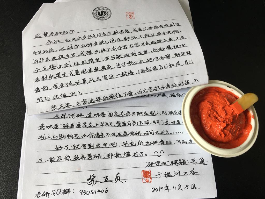 正在备考的大三学子张宸说:“拆开信封时,是惊喜,是好奇。这是一封解惑的信,通通老师用自身的真实经历,给我们讲述考研的过程,让我们更加亲切,不再惶恐;合上信封时,是感动和震撼,考研路途必然艰难,但我们一定会披荆斩棘,勇往直前。”吴泽平也感慨地说:“看了岳通通老师的信,很受鼓舞,学习到了考研的精神,也复习也更加有信心了”。