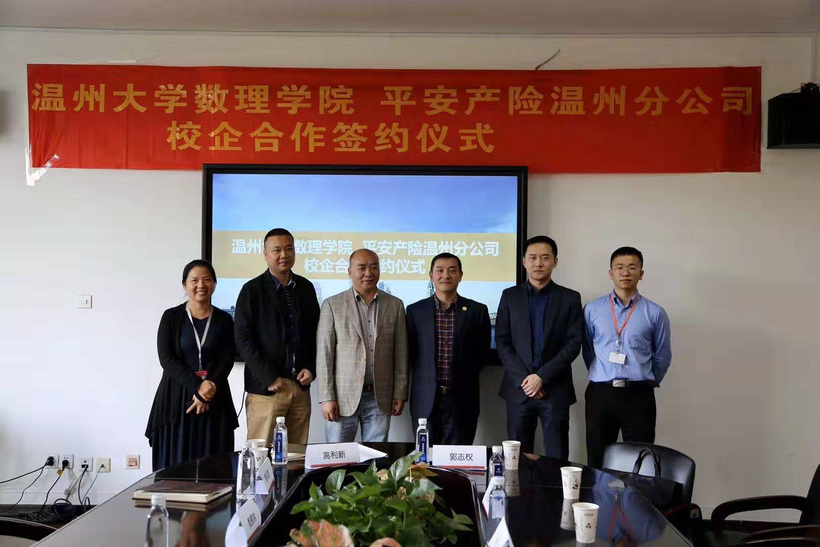 10月29日,平安产险温州分公司与sunbet申愽官网数理学院校企战略合作签约仪式在sunbet申愽官网数理学院举行。sunbet申愽官网数理学院院长高利新,数理学院副院长蔡风景,数理学院副教授黄辉林,平安产险温州分公司副总经理郭志权,人事行政部经理赵泽臣出席本次签约仪式,高利新院长与郭志权副总经理代表校企双方签署了校企战略合作协议。