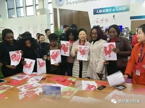 2017、2018、2019连续三年带领留学生参加温州文博会,张老师不仅展示了她的部分作品,还带领留学生为观众现场剪纸,并将作品分送给市民,受到各方人士的赞誉。2018年11月,张老师受邀出席在法国巴黎举行的论坛,在法国议会维克多·雨果厅和联合国教科文总部展出剪纸作品,并在论坛上发言,介绍中国传统文化以及在大学的教学活动。