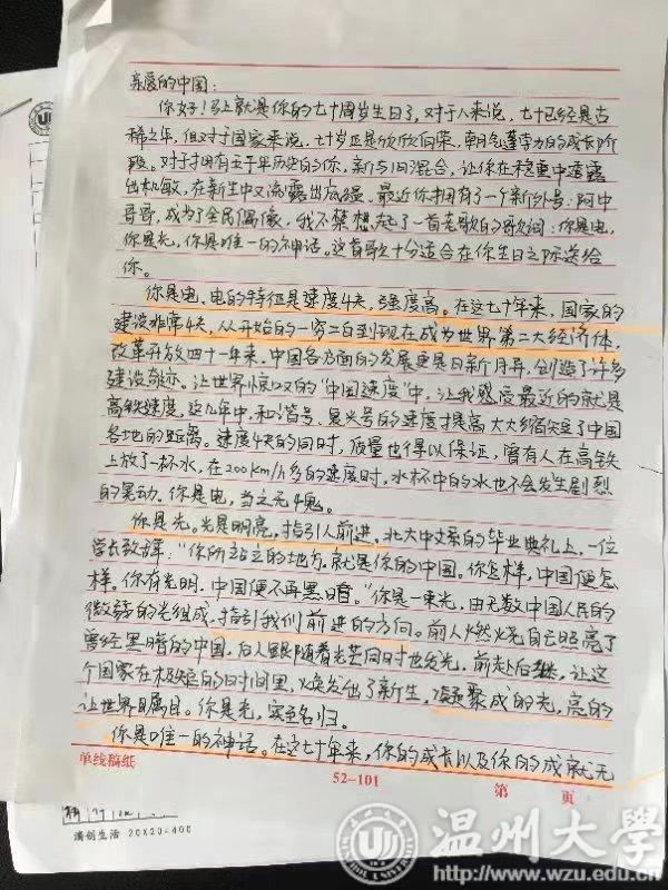 党员写来的很多“情书”都回顾了新中国成立以来取得的令人瞩目的成就,赞美之情、自豪之感溢于言表。电气电子学院本科生第一支部的党员张川套用歌词写道:“你是电,出现便是石破天惊;你是光,指引方向,闪耀夺目;你是唯一的神话,七十年奇迹般飞速发展,令人心折!你是我们的super star!”想这样的充满力量的赞美比比皆是,让人读来倍感振奋。