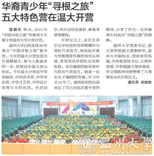 温都讯 7月21日,2019年“中国寻根之旅”华裔青少年夏令营sunbet申愽官网分营开营。