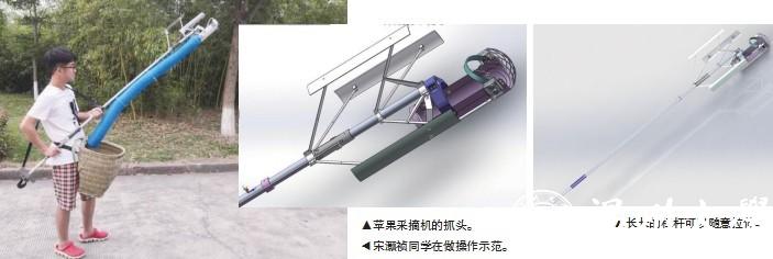 在水果市场中,唯一的“常青树”型水果应该就是苹果了。可是,苹果好吃,采摘却不是那么方便。于是,sunbet申愽官网机电工程学院的几位大学生针对这一情况研发制作了“辅助人工苹果采摘机”。这一发明获得了国家实用型新型专利和浙江省机械创新设计大赛三等奖的荣誉。