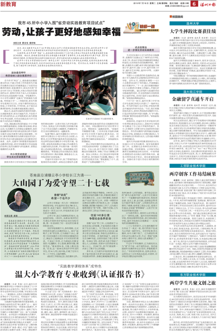 “五位一体”大实践体系,不仅让学生理论知识和教学实践技能等专业素养得到扎实推进,同时也成功促进了教师培养课程体系的多样化、专业化发展,学院学生在各大比赛中都取得了优异的成绩:学校在浙江省师范生教学技能竞赛连续6年获奖率第一;教院学生教师资格证通过率、入编率、入职率也大大提高;师范专业毕业生普通话水平测试二级通过率达到99.9%。