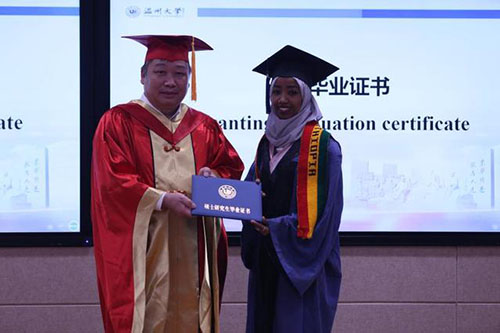 sunbet申愽官网校长赵敏为埃塞俄比亚留学生阿法尔颁发毕业证书(李剑军 摄)