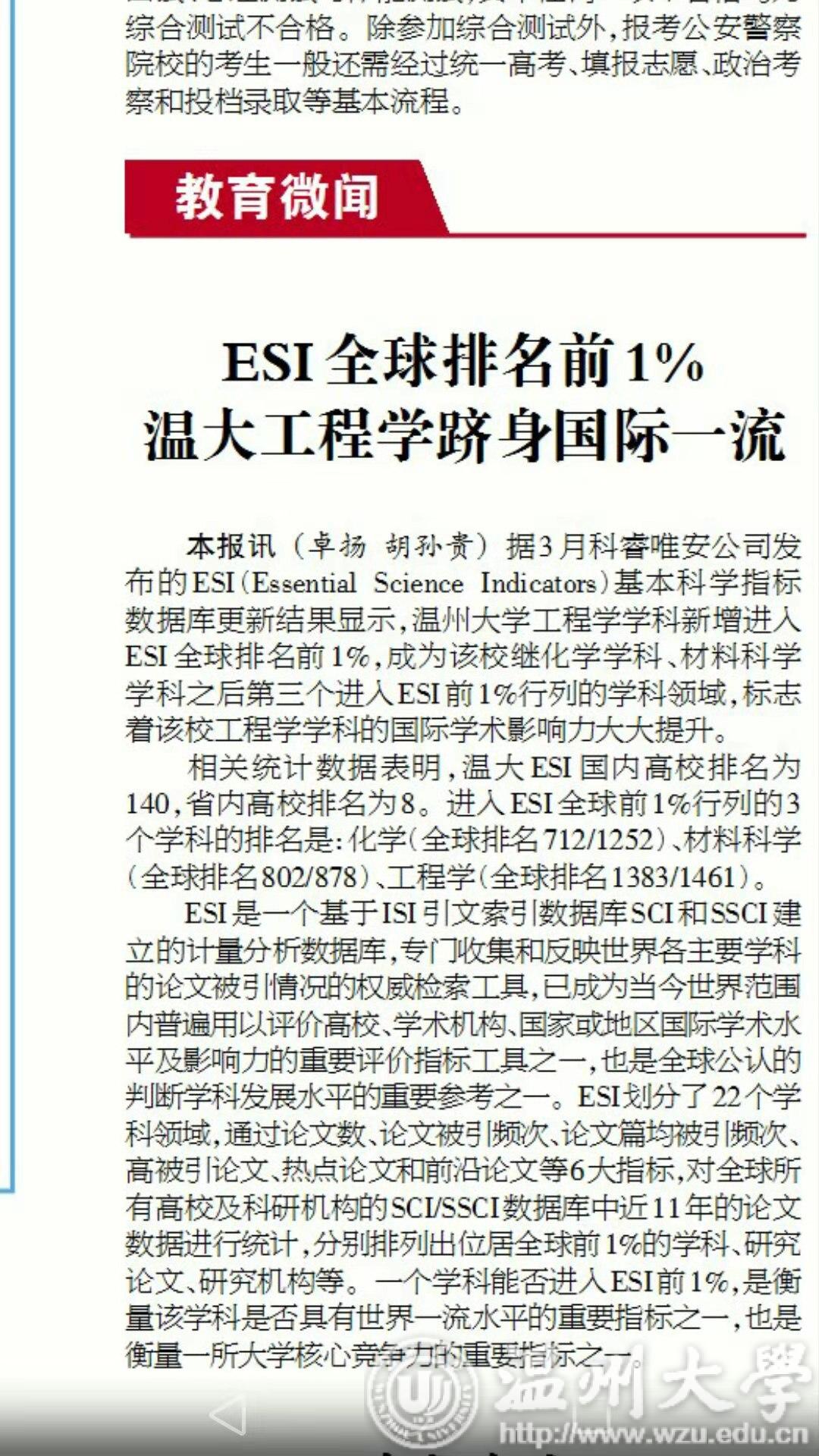 ESI是一个基于ISI引文索引数据库SCI和SSCI建立的计量分析数据库,专门收集和反映世界各主要学科的论文被引情况的权威检索工具,已成为当今世界范围内普遍用以评价高校、学术机构、国家或地区国际学术水平及影响力的重要评价指标工具之一,也是全球公认的判断学科发展水平的重要参考之一。ESI划分了22个学科领域,通过论文数、论文被引频次、论文篇均被引频次、高被引论文、热点论文和前沿论文等6大指标,对全球所有高校及科研机构的SCI/SSCI数据库中近11年的论文数据进行统计,分别排列出位居全球前1%的学科、研究论文、研究机构等。一个学科能否进入ESI前1%,是衡量该学科是否具有世界一流水平的重要指标之一,也是衡量一所大学核心竞争力的重要指标之一。
