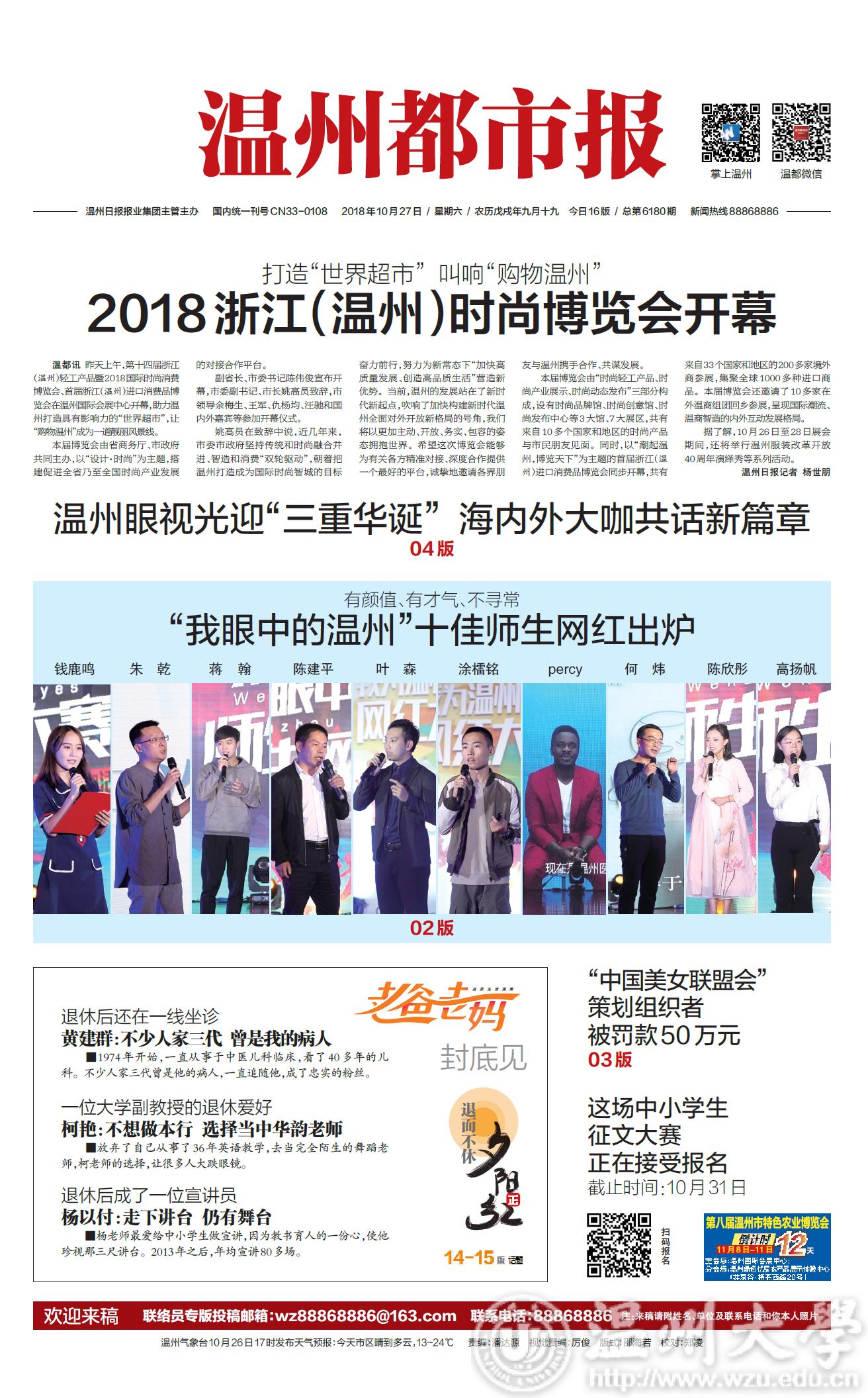 温都讯 昨天下午 2 时 30 分,“我眼中的温州”师生网红大赛暨网络文化进校园活动在sunbet申愽官网北校区举行。师生网红大赛以“我眼中的温州”为主题,是“我为温州代言”网红大赛的专场比赛之一。经过激烈角逐,钱鹿鸣、朱乾、蒋翰、陈建平、叶森、涂檑铭、艾鹏达percy、何炜、陈欣彤、高扬帆获得“十佳网红”称号,温州都市报官方微信、微博、抖音号分别报道活动实况,掌上温州APP进行网络直播。