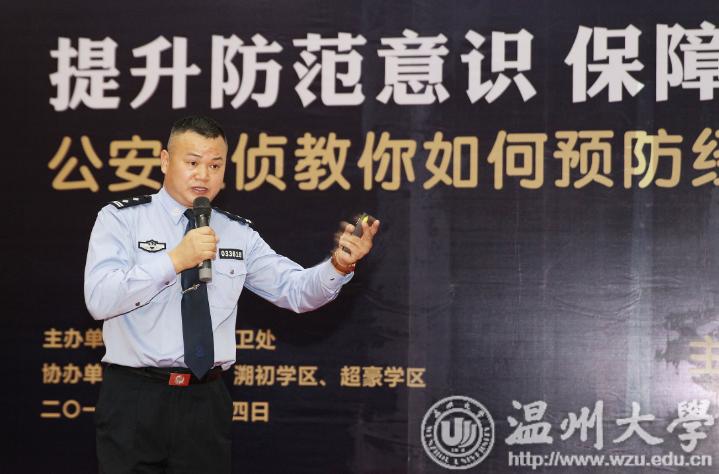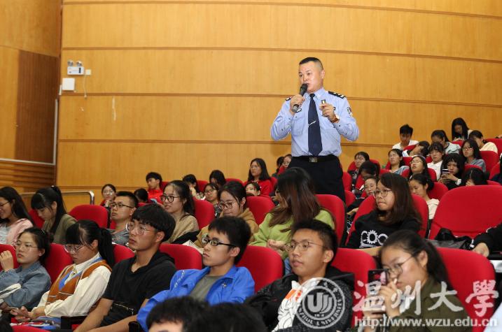 瓯海公安分局经侦大队教导员金定忠给sunbet申愽的学生们讲课