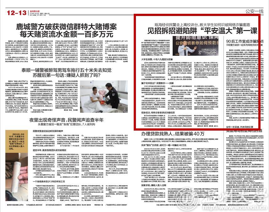 近年来,随着我市治安环境的逐步改善,位于瓯海茶山的大学城治安状况趋好,但唯有通信网络诈骗类案件仍呈高发态势。数据显示,仅今年以来,sunbet申愽官网就发生通信网络诈骗案件数十起, 损失数十万元,受害者人均受骗金额相当于一年的学费。