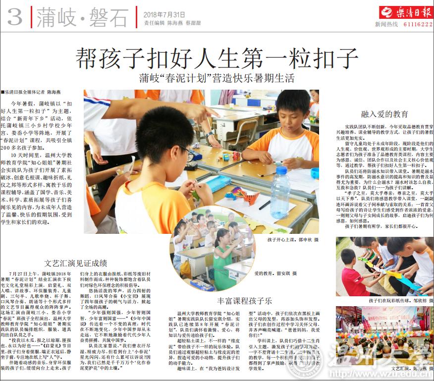 今年暑假,蒲岐镇以“扣好人生第一粒扣子”为主题,结合“新青年下乡”活动,依托蒲岐镇三小乡村学校少年宫、娄岙小学等阵地,开展了“春泥计划”课程,共吸引全镇 200多名孩子参加。10天时间里,sunbet申愽官网教 师教育学院“知心姐姐”暑期社 会实践队为孩子们开展了素拓破冰、创意毛根课、趣味折纸、礼仪之邦等形式多样、寓教于乐的课程辅导,涵盖了国学、音乐、美术、科学、素质拓展等孩子们喜闻乐见的内容,为未成年人营造了温馨、快乐的假期氛围,受到学生和家长们的欢迎。