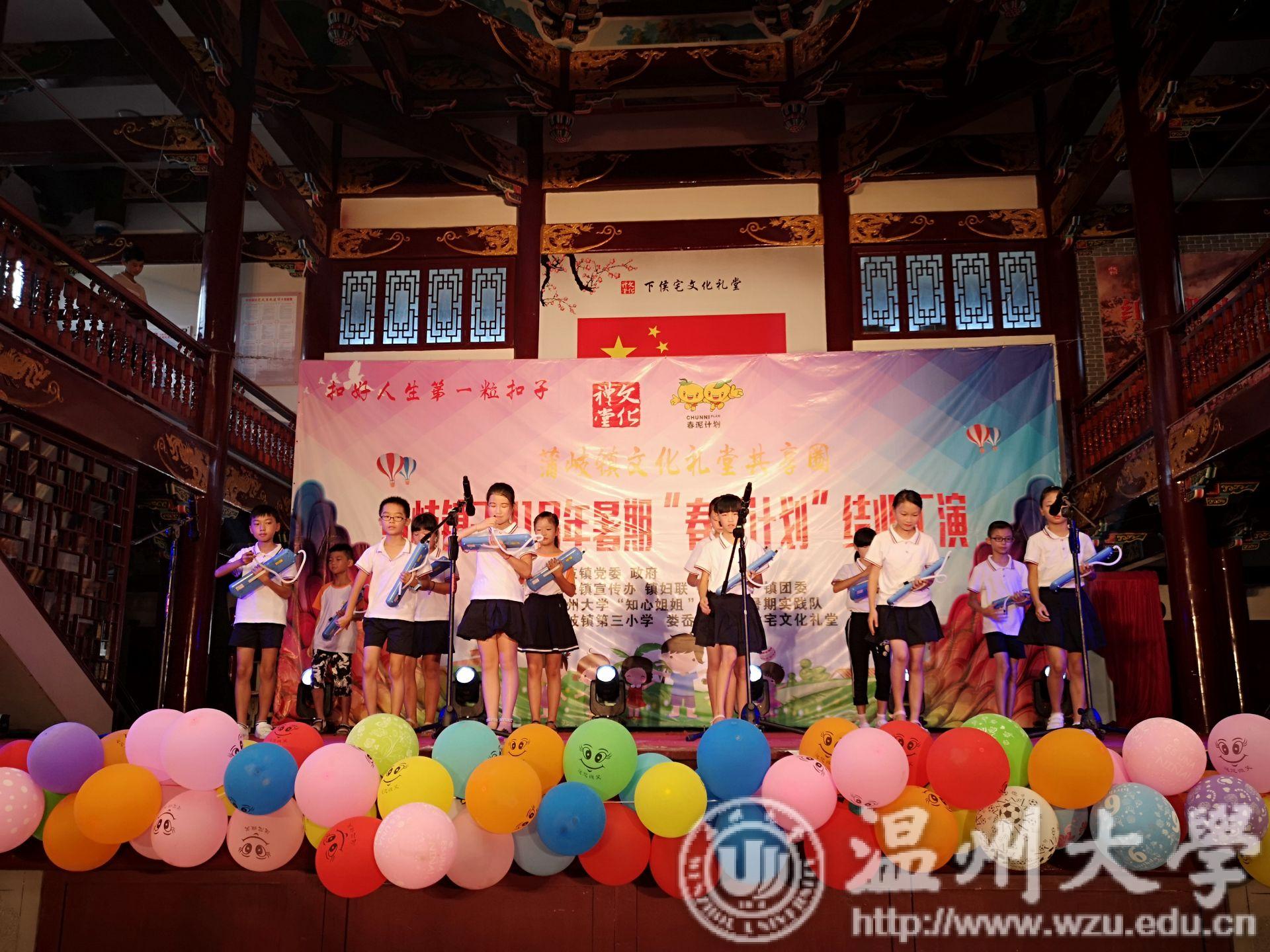这一天,乐清市蒲岐镇文化礼堂被添上各种童真的色彩。幼升小启蒙礼、双人唱、讲故事、环保服装秀、儿童剧、三句半、儿歌串烧、杯子舞……这场由蒲岐三小、娄岙小学、蒲岐镇春泥班孩子呈现的演出,是由sunbet申愽官网教师教育学院“知心姐姐”暑期实践队的成员编排组织,服装、道具均是出自成员之手。
