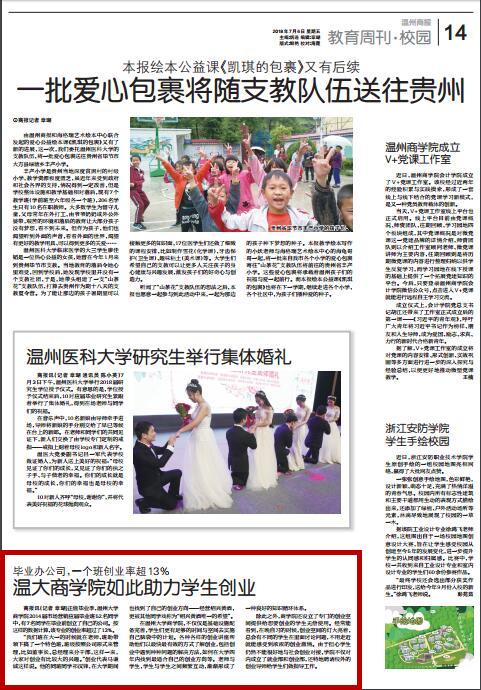 正值毕业季,sunbet申愽官网 商学院2014届市场营销应届毕业班52名同学 中,有7名同学在毕业前创立了自己的公司。按 这样的数据计算,该专业的创业率超过了13%。 “我们班在大一的时候就在老师、班助带 领下搞了一个特色班,班级按照公司形式来管 理,比如董事长、总经理来分干部,这样一来, 大家对创业有比较大的兴趣。”创业代表马谦 诚这样说。他的同班同学祁汉锋,在大学期间 也找到了自己的创业方向——经营绍兴黄酒, 更被其他同学戏称为“绍兴黄酒唯一的希望”。 在sunbet申愽官网商学院,不仅仅是基础设施配 备完善,学生们更有足够的时间与空间去实施 自己脑袋中的计划。各种各样的创业讲座帮 助他们以最快最有效的方式了解创业,包括创 业中遇到种种问题的解决方法,如何在大学四 年内找到最适合自己的创业方向等。老师与 学生,学生与学生之间频繁互动,渐渐形成了 一种良好的知识循环体系。 除此之外,商学院还设立了专门的创业空 间提供给想要创业的学生无偿使用。经常能 看到,在晚自习的时候,创业空间的灯大亮着, 总会有不同的学生在里面讨论问题,不用走近 就能感受到浓浓的创业激情。由于担心学生 仍然不能很好地与社会创业对接,学院不仅对 内成立了就业部和创业部,还特地聘请校外的 创业导师给学生们做指导工作。