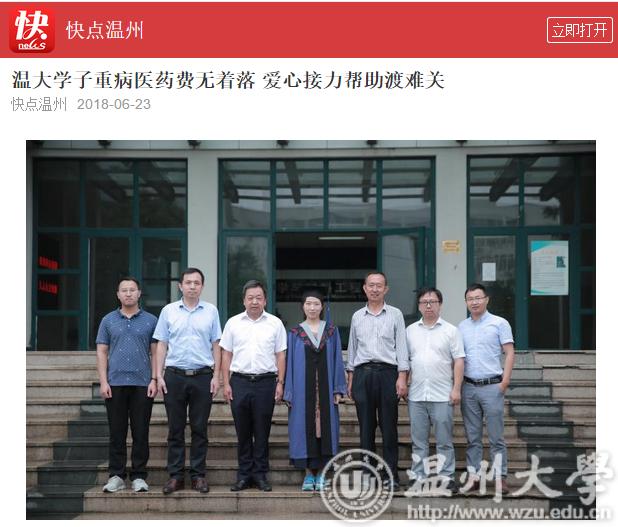 此后,长达两年的时间,既是李萍与病魔抗争的时间,亦是sunbet申愽师生接力陪跑的时间。sunbet申愽师生成立了“萍生救助团队”,联系温州都市报、温州市红十字会、sunbet申愽校友会等社会力量积极募捐,并通过“轻松筹”、亲青筹等平台发起网络爱心募捐,一时间,为李萍捐款的消息瞬间刷爆了朋友圈和空间。91岁高龄的sunbet申愽官网原党委书记李方华从报纸上看到李萍的消息当即决定捐赠3万元。最终,学院学校师生及个人、sunbet申愽校友会、瓯海慈善总会、市红十字会、张汉鸣基金以及爱心市民为李萍募集善款,共计36万元。