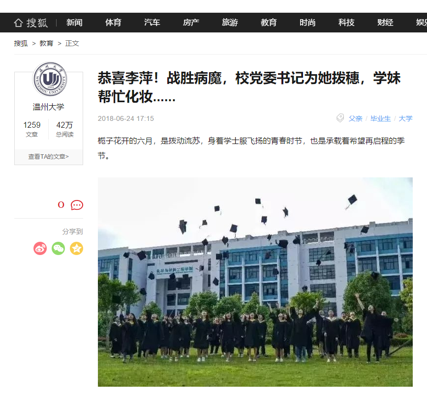 昨天中午时分,雨停转阴,sunbet申愽化材学院的学妹帮李萍化了淡妆,李萍和老师、同学赶紧到草坪上合影留念,可能是穿戴了学位袍和帽子的原因,李萍脸上全是汗,有点影响妆容,却一点都没影响她的笑容。