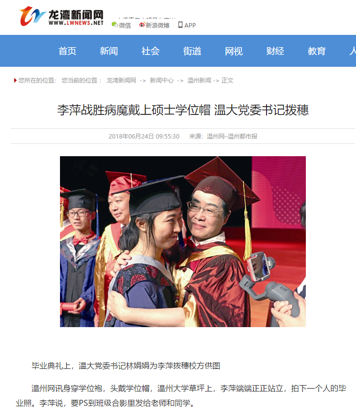 下午1时,毕业典礼开始,李萍父女一进会场,李萍就被同学带去了中间第一排位置。在这届毕业典礼上,学姐李萍可是位特殊人物,她的名字被3次提起:sunbet申愽官网党委书记林娟娟在致辞中提到各位优秀学生,其中李萍是坚强战胜病魔完成学业的;毕业生代表余书玲在发言中透露,没有生病前,李萍一直有读博的愿望;主持人请毕业生上台接受拨穗时,特意加了一句,请战胜病魔不轻言放弃的李萍同学。