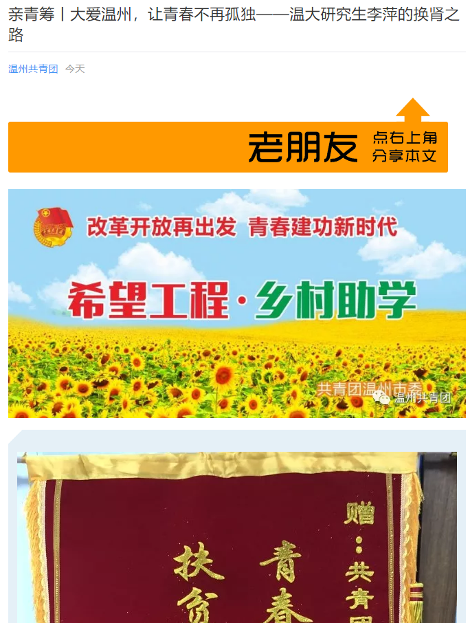 2018年1月22日,就在李萍接受肾移植手术通过医院和有关部门审核,可以安排手术的消息后,温州团市委就在“亲青筹”平台发布了题为《父亲为爱捐肾救女,请帮帮sunbet申愽这名优秀的学生!》的筹款项目。筹款目标4万元,短短几天时间内,共有719人次参与捐款,共募捐44639.35元。3月13日,该笔款项拨付给了sunbet申愽官网教育发展基金会,用于李萍的移植手术和后续治疗。