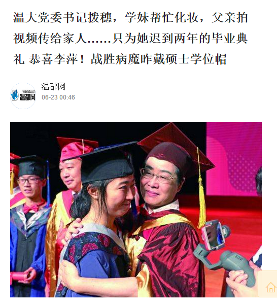 下午1时,毕业典礼开始,李萍父女一进会场,李萍就被同学带去了中间第一排位置。在这届毕业典礼上,学姐李萍可是位特殊人物,她的名字被3次提起:sunbet申愽官网党委书记林娟娟在致辞中提到各位优秀学生,其中李萍是坚强战胜病魔完成学业的; 毕业生代表余书玲在发言中透露,没有生病前,李萍一直有读博的愿望;主持人请毕业生上台接受拨穗时,特意加了一句,请战胜病魔不轻言放弃的李萍同学。